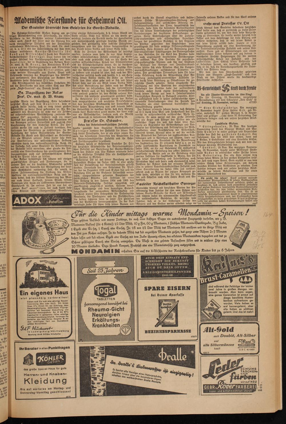 Fiihyer verliehenen Goethe-Medaille für Kun st und Wissenschaft durch den Gauleiter Reichsstatthalter Sprenger. Dazu hatten sich im großen Hörsaal des Dorlesungsgebäudes mit dem Gauleiter, der in Begleitung des Rektors Prof. Dr. med. H. W. Kranz, des Kreisleiters Backhaus und des Oberbürgermeisters und Ehrensena- türs der Ludwigs-Universität Ritter erschien, zahl- reicke weitere Ehrengäste aus Partei, Staat und Wehrmacht inmitten der Angehörigen des Lehrkörpers versammelt. Den Ehrenplatz zur Rechten des Gauleiters hatte Geheimrat O l t inne.