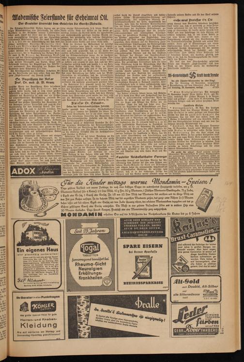 Zu Geheimrat O l t gewandt sprach der Rektor dem ausgezeichneten und verehrten Berufskameraden den herzlichen Glückwunsch der Universität zu dieser hohen Auszeichnung aus und betonte dabei, die Universität sei dankbar dafür, daß hiefe Ehrung einem ihrer Kameraden zuteil wurde, der ihrer nicht nur als Wissenschaftler, sondern auch als Mensch und Kamerad in besonderem Maße würdig sei.