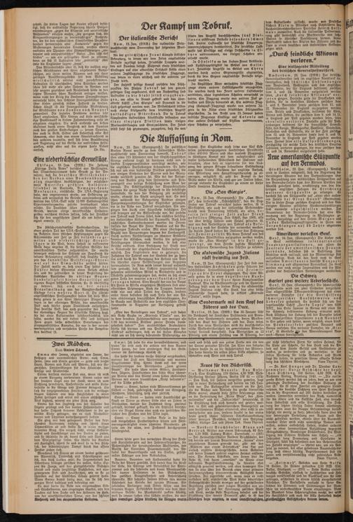 Der äußerst heftige Kampf zwischen den Stützpunkten des Platzes Tobruk hat den ganzen gestrigen Tag angedauert. Erst am Rachmittag sind Australier in die Stadt selb st eingedrungen, wo alles in Brand gesteckt und das überalterte Schiff „San Giorgio" mit Dynamit in die Luft gesprengt worden war. Im Westabschnitt leisten noch einige Stützpunkte dem feindlichen Angriff hartnäckigen widerstand. Die in Tobruk kämpfenden italienischen Streitkräfte bestanden aus einer einzigen Division sowie einigen Marineabteilungen und Grenzwächlern. Der Feind selbst sieht sich gezwungen, zuzugeben, daß die von1