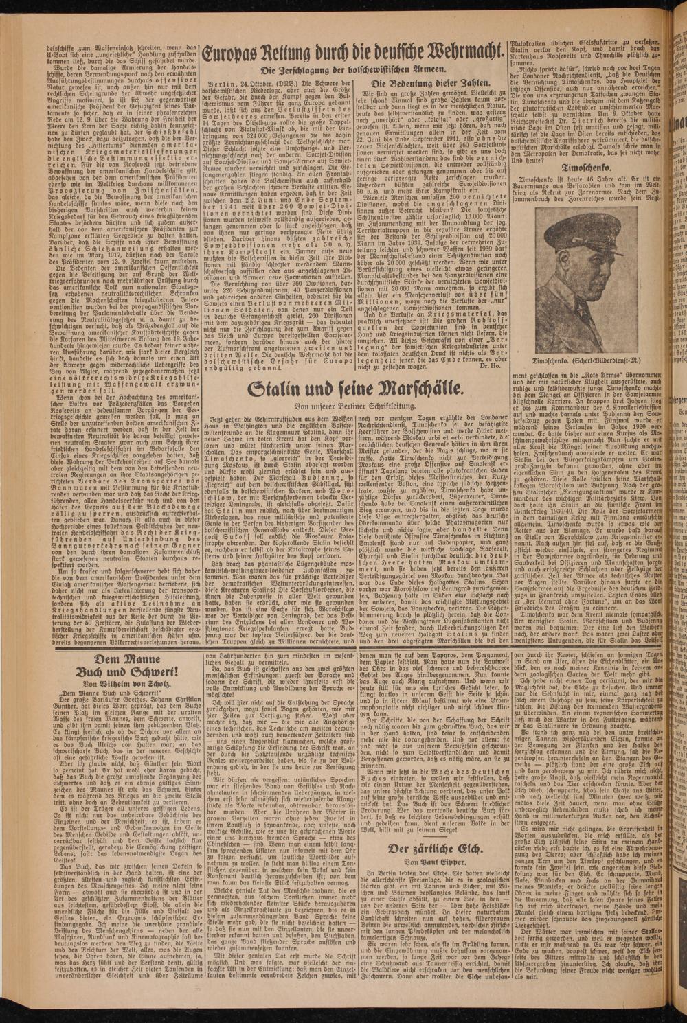 Und die Verluste an Kriegsmaterial, das praktisch unersetzbar ist! Die großen Rohstoff- quellen der Sowjetunion sind in deutscher Hand und Kriegsindustrien können nicht liefern, die umziehen. All dieses Geschwafel von einer „Verlegung" der sowjetischen Kriegsindustrien unter dem kolossalen deutschen Druck ist nichts als Verlegenheit jener, die das Ende kennen, es aber I nicht zu gestehen wagen. Dr. Ho.