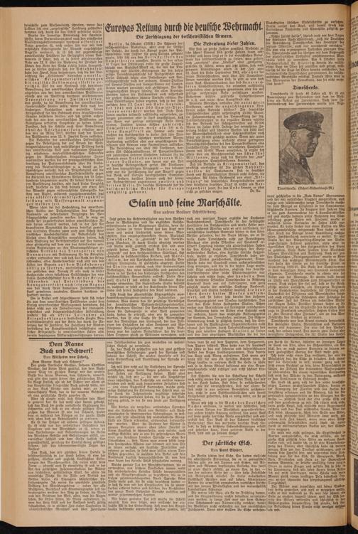 noch vor wenigen Tagen erzählte der Londoner Nachrichtendienst, Timoschenko sei der befähigtste Heerführer der Bolschewisten und werde Hitler meistern, während Moskau urbi et orbi verkündete, die' verächtlichen deutschen Generale hätten in ihm ihren Meister gefunden, der die Nazis schlüge, wo er sie treffe. Hatte Timoschenko nicht zur Verteidigung Moskaus eine große Offensive auf Smolensk eröffnet? Tagelang beteten alle plutokratifchen Juden für den Erfolg dieses Meisterstreiches, der Kurzwellensender Boston, eine typische jüdische Hetzzentrale, wußte zu erzählen, Timoschenko habe unzählige Dörfer zurückerobert, Lügenreuter, Timo- fchenko habe bei Smolensk einen außerordentlichen Sieg errungen, und bis in die letzten Tage wurde diese Lüge aufrechterhalten, obgleich das deutsche Oberkommando über solche Phatasmagorien nur lächelte und nichts sagte, aber handelt e. Denn diese berühmte Offensive Timoschenkos in Richtung Smolensk stand nur auf Judenpapier, und ganz plötzlich wurde die wirkliche Sachlage Roosevelt, Churchill und Stalin furchtbar deutlich: die deutschen Heere hatten Moskau umklammert, und sie haben jetzt bereits den äußeren Verteidigungsgürtel von Moskau durchbrochen. Das war das Ende dieses Halbgottes Stalins. Schon vorher war Woroschilow auf Leningrad zurückgewor- fen, Budjenny hatte im Süden eine Schlacht nach der anderen, damit das wichtigste Rüstungsgebiet der Sowjets, das Donezbecken, verloren. Die Götzendämmerung brach so plötzlich herein, daß die Londoner und die Washingtoner Lügenfabrikanten nicht einmal Zeit fanden, durch lleberbrücfungslügen den Weg zum neuesten Halbgott Stalins zu finden und den drei abgesägten Marschällen die bei den
