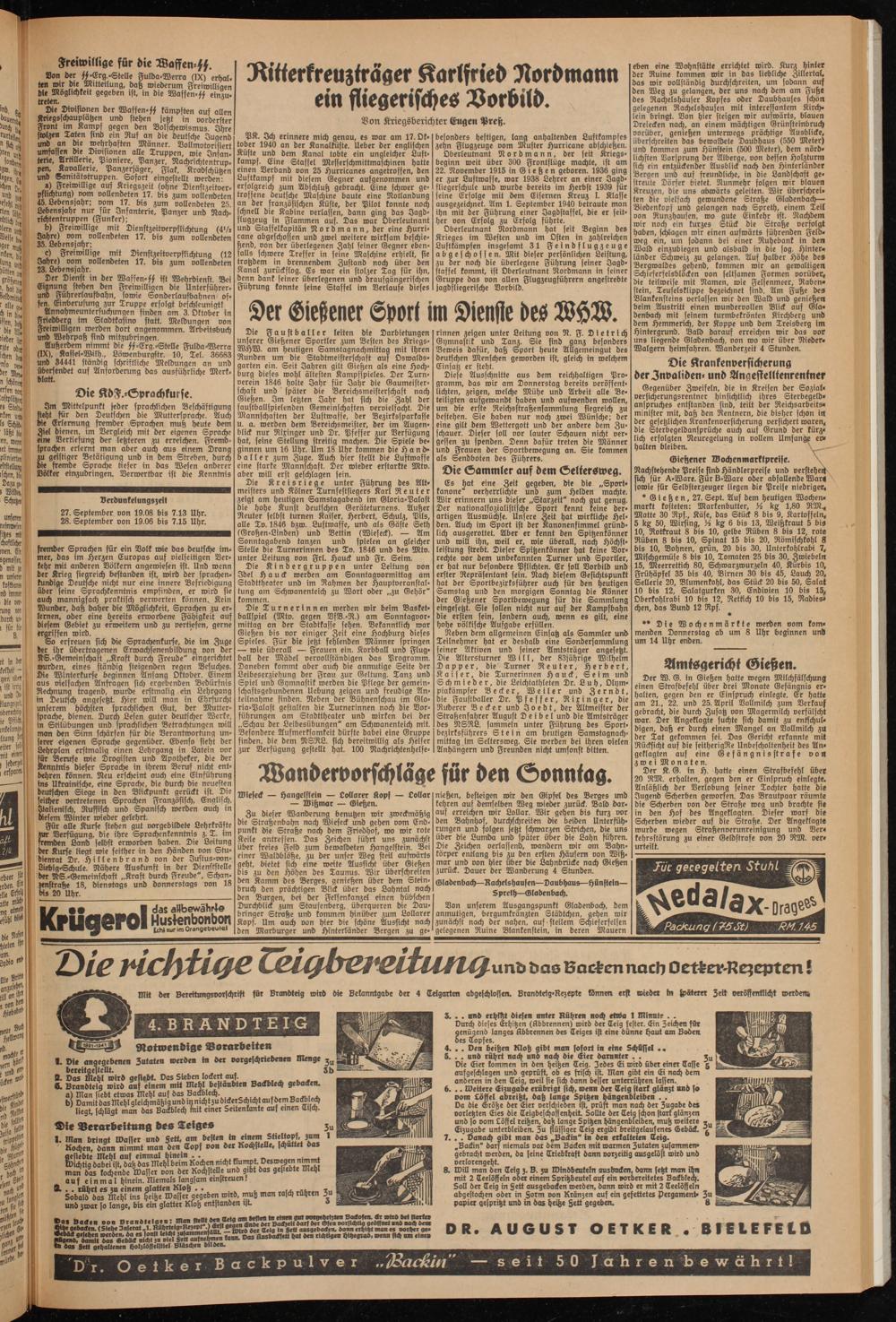 Oberleutnant Nordmann, der seit Kriegsbeginn weit über 300 Frontflüge machte, ist am 22. November 1915 in Gießen geboren. 1936 ging er zur Luftwaffe, war 1938 Lehrer an einer Jagd- fliegerfchule und wurde bereits im Herbst 1939 für feine Erfolge mit dem Eisernen Kreuz I. Klasse ausgezeichnet. Am 1. September 1940 betraute man ihn mit der Führung einer Jagdstaffel, die er seither von Erfolg zu Erfolg führte.