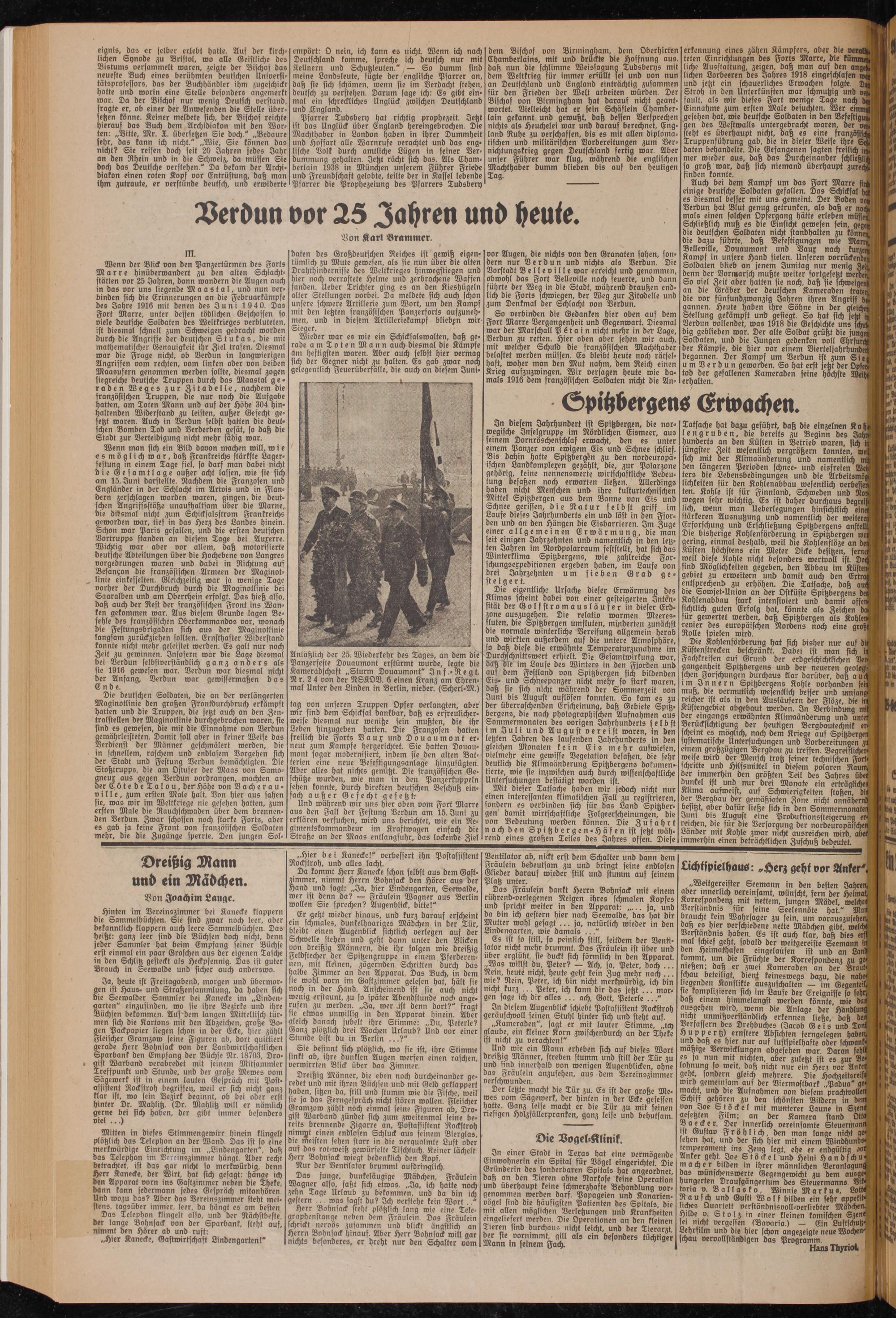 Wenn der Blick von den PanAertürmen des Forts Marre hinüberwandert zu Den alten Schlachtstätten vor 25 Jahren, dann wandern die Augen auch in das vor uns liegende Maastal, und nun verbinden sich die Erinnerungen an die Februarkämpfe des Jahre 1916 mit denen des Juni 1 940. Das Fort Marre, unter dessen tödlichen Geschossen so viele deutsche Soldaten des Weltkrieges verbluteten, ist diesmal schnell Aum Schweigen gebracht worden durch die Angriffe Der deutschen Stukas, die mit mathematischer Genauigkeit ihr Ziel trafen. Diesmal war die Frage nicht, ob Derdun in langwierigen Angriffen vom rechten, vom linken oder von beiden Maasufern genommen werden sollte, diesmal zogen siegreiche deutsche Truppen durch das Maastal geraden fffieges zur Zitadelle, nachdem die französischen Truppen, die nur noch die Aufgabe hatten, am Toten Mann und auf der Höhe 304 hinhaltenden Widerstand zu leisten, außer Gefecht gesetzt waren. Auch in Derdun selbst hatten die deutschen Bomben Tod und Verderben gesät, so daß die Stadt zur Verteidigung nicht mehr fähig war.