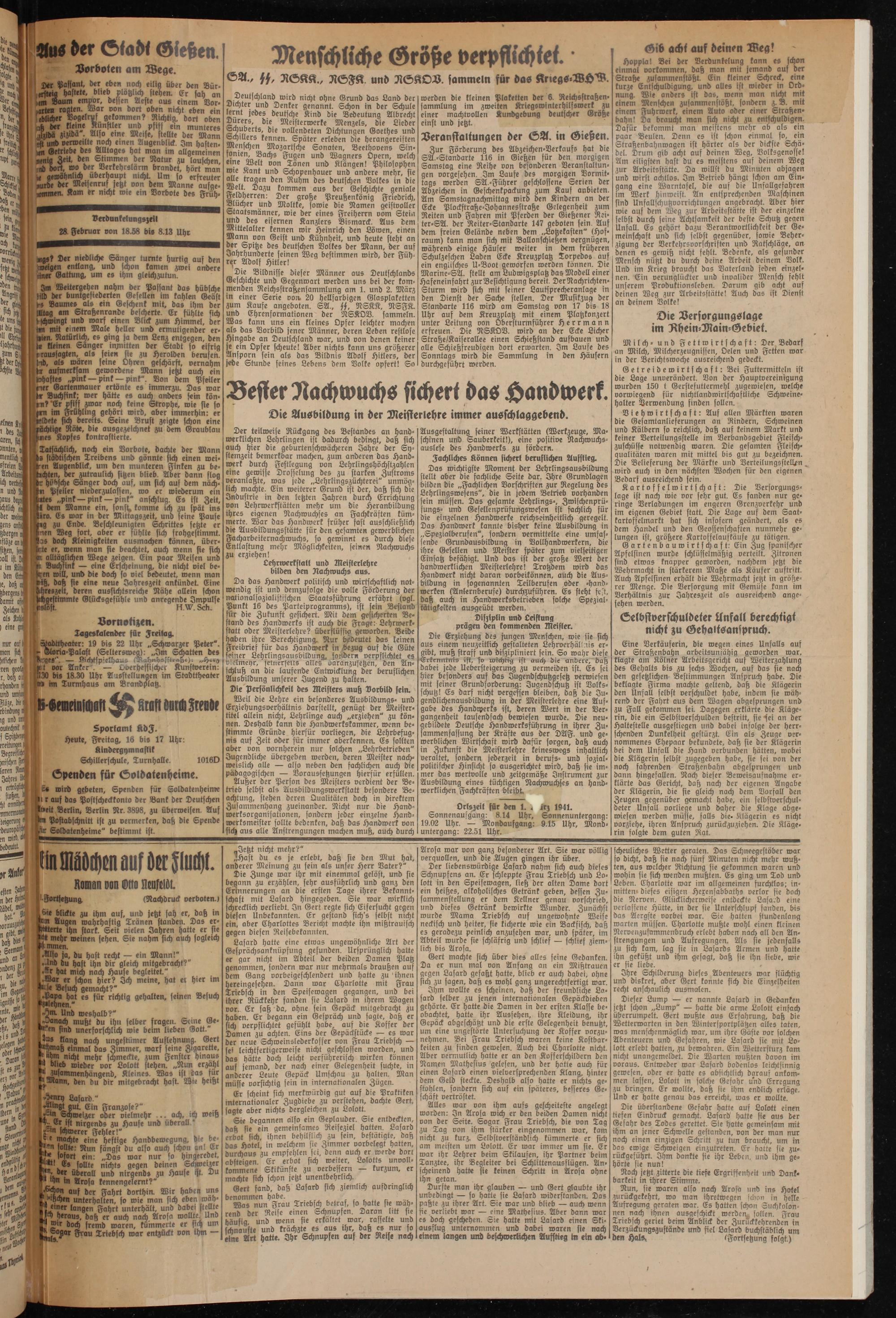 Hoppla! Bei der Verdunkelung kann es schon einmal Vorkommen, daß man mit Jemand auf der Straße zusammenstößt. Ein kleiner Schreck, eine kurze Entschuldigung, und alles ist wieder in Ordnung. Wie anders ist das, wenn man nicht mit einem Menschen zusammenstößt, sondern z. B. mit einem Fuhrwerk, einem Auto oder einer Straßenbahn! Da braucht man sich nicht zu entschuldigen. Dafür bekommt man meistens mehr ab als ein paar Beulen. Denn es ist schon einmal so, ein Straßenbahnwagen ist härter als der dickste Schädel. Drum gib acht auf deinen Weg, Volksgenosse! Am eiligsten hast du es meistens auf deinem Weg zur Arbeitsstätte. Da willst bu Minuten abjagen und wirst achtlos. Irn Betrieb hängt schon am (Eingang eine Warntafel, die auf die Unfallgefahren im Werk hinweist An entsprechenden Maschinen find Unfallschutzvorrichtungen angebracht. Aber hier wie auf dem Weg zur Arbeitsstätte ist her einzelne selbst durch seine Achtsamkeit der beste Schutz gegen Unfall. Es gehört bazu Verantwortlichkeit ber Gemeinschaft und sich selbst gegenüber, sowie Beherzigung ber Verkehrsoorschriften und Ratschläge, an denen es gewiß nicht fehlt. Bedenke, als gesunder Mensch nützt du durch deine Arbeit deinem Volk. Und im Krieg braucht das Vaterland jeden einzelnen. Ein verunglückter und invalider Mensch fehlt unserem Produktionsleben. Darum gib acht auf deinen Weg zur Arbeitsstätte! Auch das ist Dienst an deinem Volke!