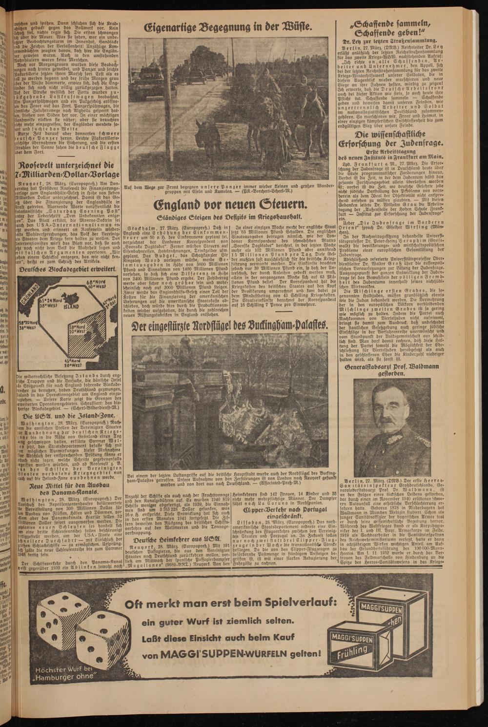In einer einzigen Woche macht der englische Staat jetzt '63 Millionen Pfund Schulden. Die englischen Staatsausgaben betrugen nämlich, wie der Londoner Korrespondent des schwedischen Blattes „Svenska Dagbladet" berichtet, in der letzten Woche mehr als 102 Millionen Pfund oder annährnd 15 Millionen Pfund pro Tag. Diese Gelder mußten fast ausschließlich für die britische Kriegführung verwandt werden. Die Einkünfte brachten jedoch nur 39 Millionen Pfund ein, so daß der Unterschuß, der durch Anleihen gedeckt werden muß, allein in der vergangenen Woche sich auf 63 Millionen Pfund belief. Der Korrespondent hat die Kriegskosten des britischen Staates auf den Kops der Bevölkerung umgerechnet und kam dabei zu dem Mindestbetraa von 43 Schilling Kriegskosten. Die Staatseinkünfte berechnet der Korrespondent auf 16 Schilling 7 Pence pro Einwohner.