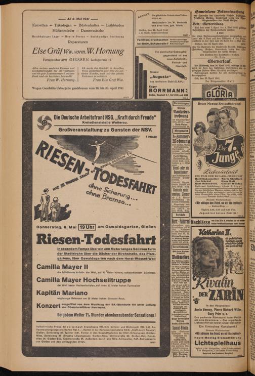 Volkstümliche Preise. Im Vorverka uf: Erwachsene RM. 0.70, Schüler und Wehrmacht RM. 0.40. Am Veranstaltungstage alle Karten RM. 1.-. Karten in der Kartenverkaufsstelle NSG. „Kraft durch Freude“, Gießen, Seltersweg 60, Telefon 2141. Ferner in den Geschäftsstellen der NSV.-Ortsgruppen, Gießen- Mitte, Seltersweg 38 (Eingang Löwengasse); Gießen-Nord, Walltorstraße 38; Gießen-Ost, Kaiserallee 34; Gießen-Süd, Crednerstraße 24. Außerdem durch alle NSV.-Amtswalter, KdF.-Betriebswarte