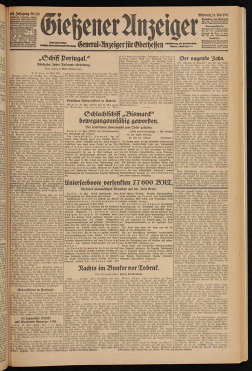 Im Kampf gegen die sich allmählich verstärkenden feindlichen Seeslrettkräfte sod)t da» Schlachlschisf „Bismarck" in seinem bewegungsnnfähigen Zustand, biv ev endlid) am 27. Wal vormittag» das Opfer von drei brllljdjni Schtachtschisfen, einem Fing zeug träger, mehreren Kreuzern nnd Zerstörern geiyor den ist. Der britische verband selbst wird seit heute früh öurd) deulsdie Kampfflugzeuge angegriffen.