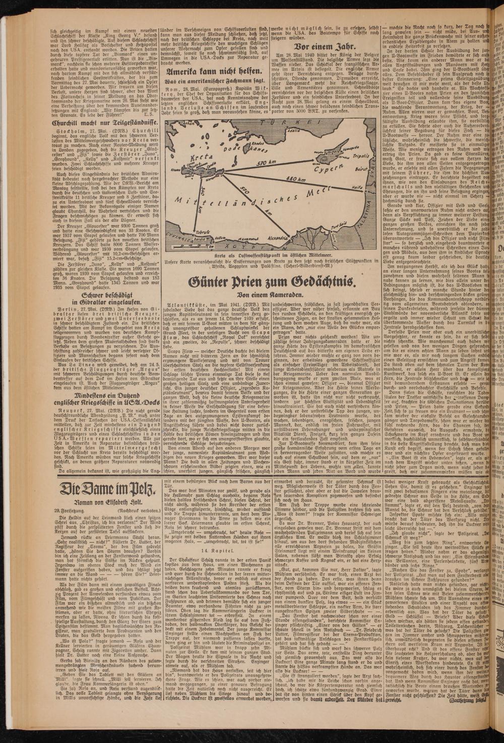 länder im Verschweigen von Schiffsverlusten sind, kann man aus dieser Melduna schließen, daß jetzt, nach der britischen Schlappe bei Kreta, noch weit mehr britische Kriegsschiffe den roudjtigen Schlagen unserer Wehrmacht zum Opfer gefallen sind und demnächst, soweit sie noch schwimmfähig sind, auf Umwegen in die USA.-Docks zur Reparatur gebracht werden.