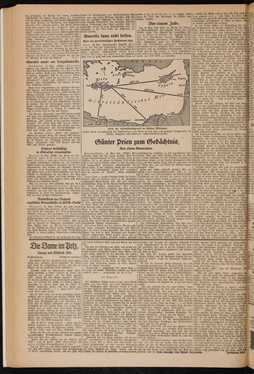 Aus La Linea wird gemeldet, daß am 24.5. der britische Flugzeugträger „Argus" mit schweren Beschädigungen durch deutsche Bombentreffer auf dem Deck im Hafen von Gibraltar eingelaufen ist. Auch der Flugzeugträger „Argus" kam aus dem östlichen Mittelmeer.