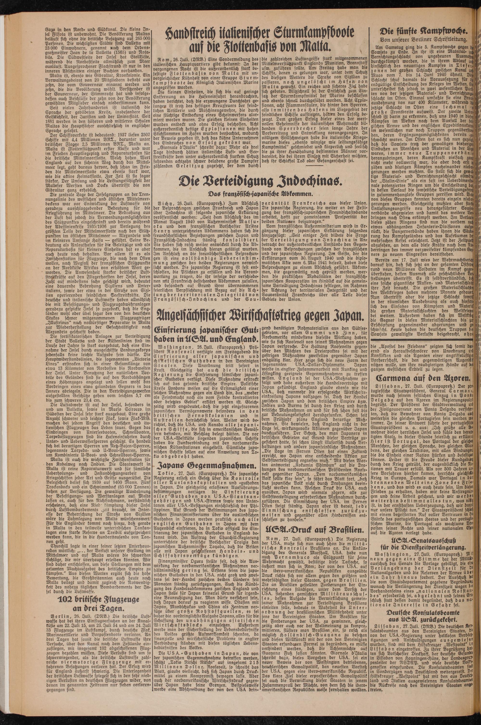 Die U S A. - G u t h a b e n i n I a p a n, die von der japanischen Gegenmaßnahme betroffen werden, schätzt „Tokio Nitschi Nitschi" auf insgesamt 215 Millionen Dollar. Roosevelt, so schreibt das Blatt, glaube vielleicht, daß sich Japan durch Druckmittel zu einem Kompromiß bewegen lasse. Aber auch der nordamerikanische Wirtschaftsdruck gegenüber Japan habe feine Grenzen. Beispielsweise werde eine Abschneidung der von den USA drin-
