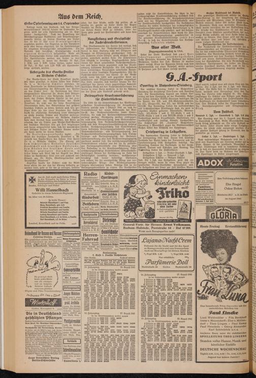 Am nächsten Sonntag findet in Watzenborn- Steinberg der diesjährige Orts-Turn- und Sporttag statt. Die Veranstaltung beginnt am frühen Vormittag auf dem Sportplatz an der Neumühle. Außer den beiden örtlichen NSRL.-Vereinen beteiligen sich die Partei, die SA. und SA.-Wehrmannschaften, die HI., Flieger-HI., das DJ., der BDM. und der BDJM. Am Vormittag finden die volkstümlichen und leichtathletischen Wettkämpfe statt. Es wird in folgenden Klassen gestartet: Altersklasse, Männerklasse, HJ.-Klasse 1 und 2, DJ.-Klasse 1 und 2, BDM.-Klasse 1 und 2 und BDJM.-Klasse 1 und 2. Nachmittags werden Einzelkämpfe, Staffelläufe, ein Handballspiel und sonstige Kämpfe durchgeführt. Ein Fußballspiel FE. „Teutonia" Watzenborn- Steinberg 1. Mannschaft gegen die Stadtmannschaft Gießen bildet den Abschluß des Sporttages.