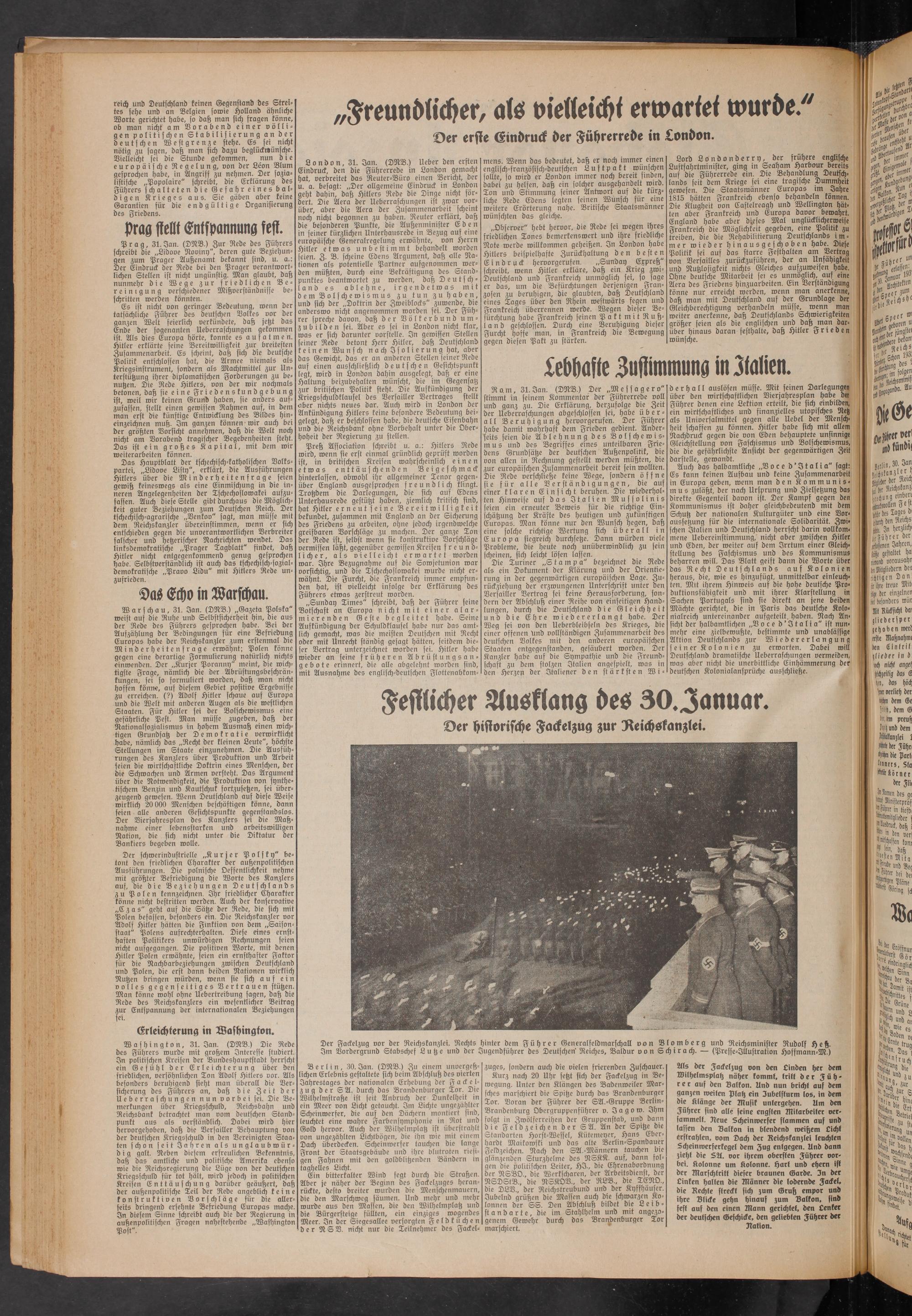 Ein bitterkalter Wind fegt durch die Straßen. Aber je näher der Beginn des Fackelzuges heranrückte, desto breiter wurden die Menschenmauern, die den Marschweg säumen. Und mehr und mehr wurde aus den Massen, die den Wilhelmplatz und die Bürgersteige füllten, ein einziges wogendes Meer. In der Siegesallee versorgten Feldküchen der NSV. nicht nur die Teilnehmer des Fackel