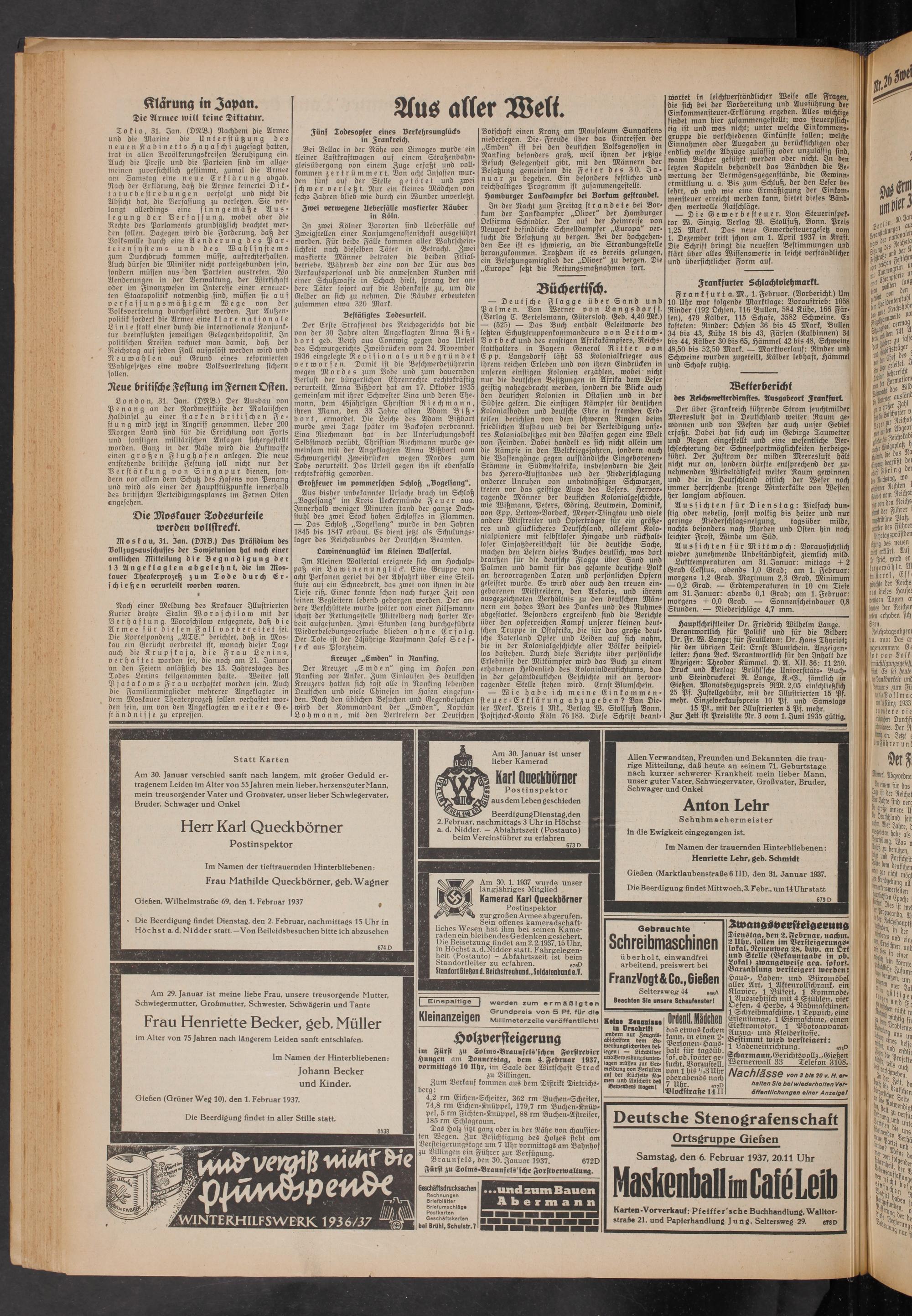Hauptschriftleiter Dr. Friedrich Wilhelm Lange. Verantwortlich für Politik und für die Bilder: Dr. Fr. W. Lange; für Feuilleton: Dr. Hans Thyriot; für den übrigen Teil: Ernst Blumschein. Anzeigenleiter: Hans Beck. Verantwortlich für den Inhalt der Anzeigen: Theodor Kümmel. D. A. XII. 36: 11250. Druck und Verlag: Brühl'sche Universitäts- Buch- und Steindruckerei R. Lange, K.-G., sämtlich in Gießen. Monatsbezugspreis RM. 2,05 einschließlich 25 Pf. Zustellgebühr, mit der Illustrierten 15 Pf. mehr. Emzelverkaufspreis 10 Pf. und Samstags