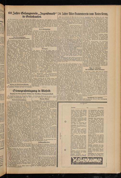 LPD. Darmstadt, 31. Mai. Der Hessische Alice-Frauenverein vom Roten Kreuz beging am Sonntag die Feier seines 70iährigen B e st e h e n s und hatte aus diesem Anlaß feine Mitglieder, die Zweig- und Kreisvereine, die Schwesternschaften, Kriegspflegerinnen und Freunde zu einer Kundgebung geladen, die in der Festhalle zu Darmstadt stattfand.