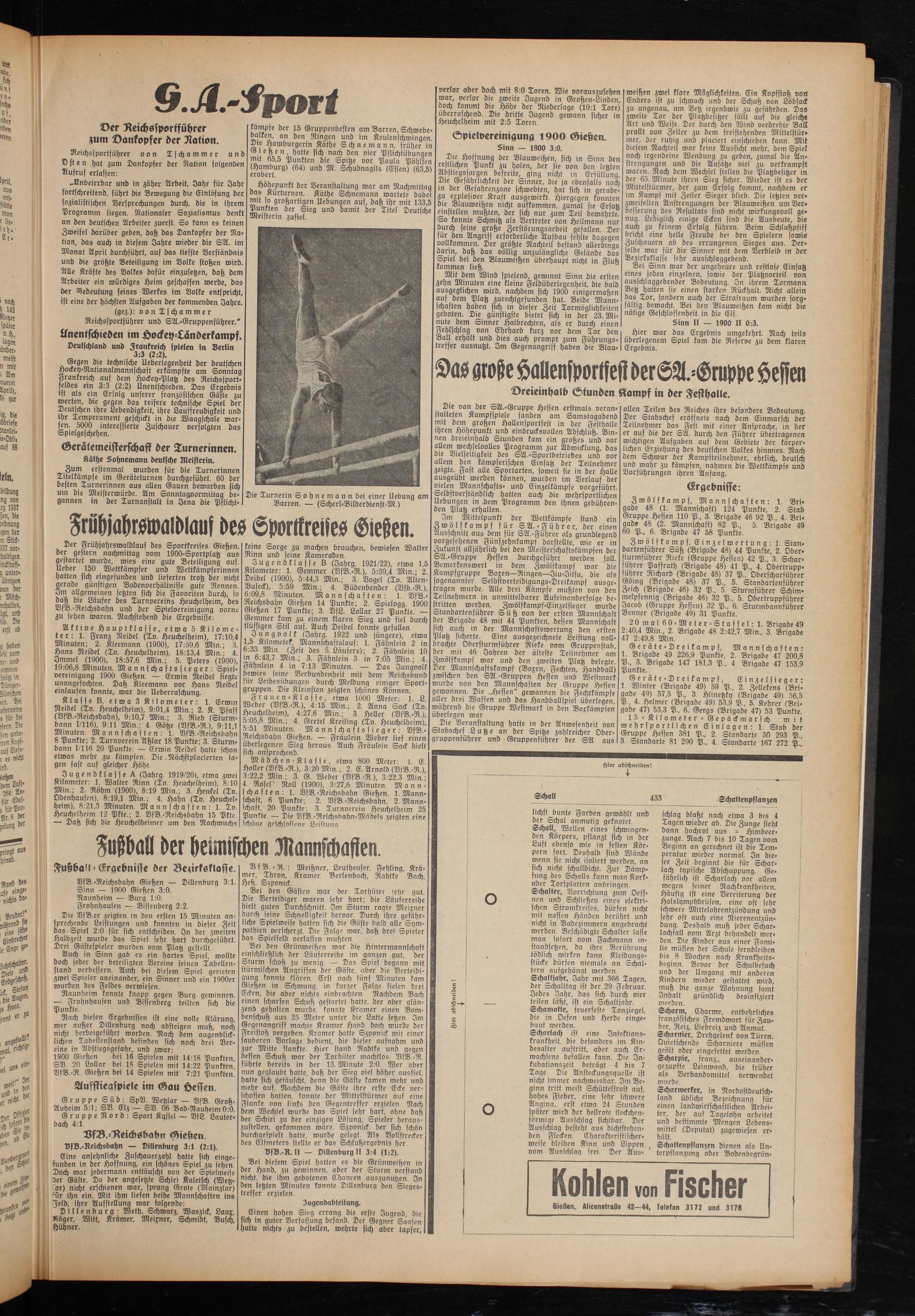 Jugendklasse A (Jahrg. 1919/20), etwa zwei Kilometer: 1. Walter Rinn (To. Heuchelheim), 8:10 Min.; 2. Röhm (1900), 8:19 Min.; 3. Henkel (Tv. Odenhausen), 8:19,1 Min.; 4. Hahn (Tv. Heuchelheim), 8:21,3 Minuten. Mannschaften: 1. Tv. Heuchelheim 12 Pkte.; 2. VfB.-Reichsbahn 15 Pkte. — Daß sich die Heuchelheimer um den Nachwuchs
