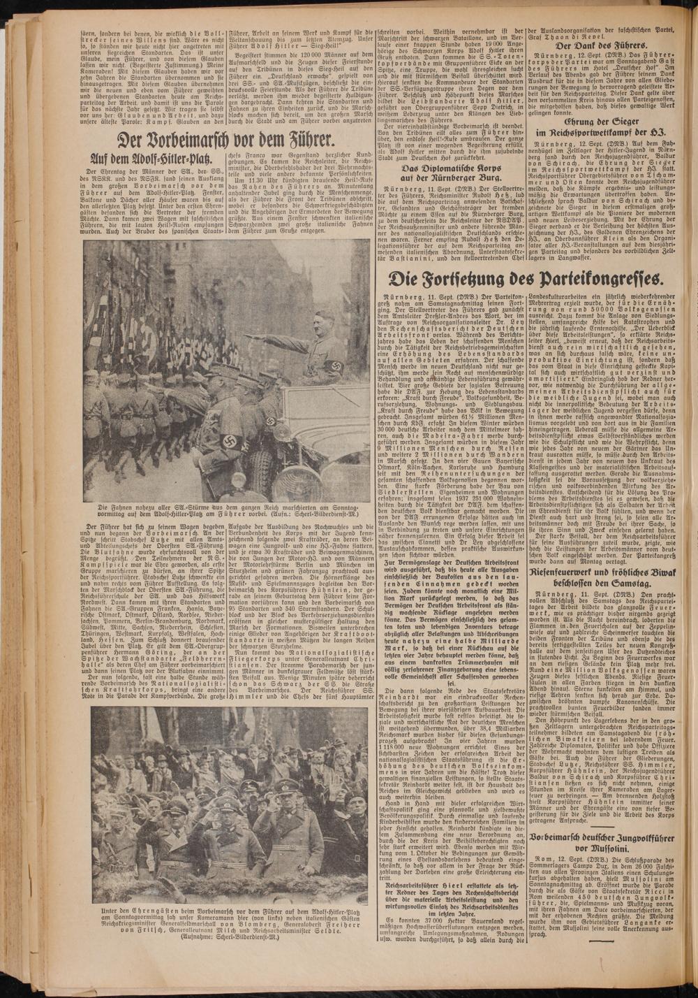 Begeistert stimmen die 120 000 Männer auf dem Aufmarschfeld und die Zeugen dieser Feierstunde auf den Tribünen in dieses Sieg-Heil auf den Führer ein. „Deutschland erwache", gespielt von drei SS.- und SA.-Musikzügen, beschließt die eindrucksvolle Feierstunde. Als der Führer die Tribüne verläßt, werden ihm wieder begeisterte Huldigungen dargebracht. Dann kehren die Standarten und Fahnen zu ihren Einheiten zurück, und die Marschblocks machen sich bereit, um den großen Marsch durch die Stadt und am Führer vorbei anzutreten