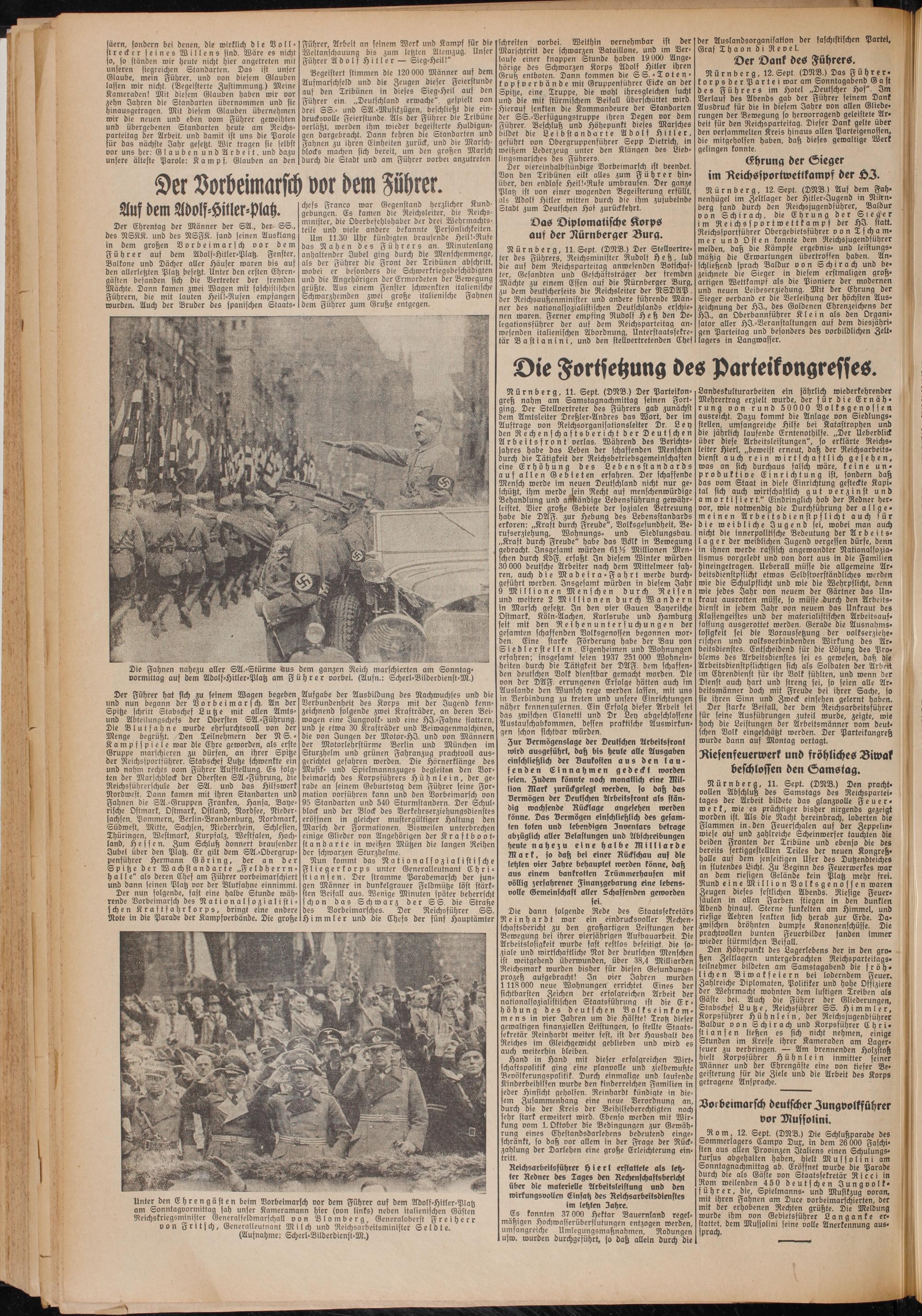 Der Ehrentag der Männer der SA., der SS., des NSKK. und des NSFK. fand seinen Ausklang in dem großen Vorbeimarsch vor dem Führer auf dem Adolf-Hitler-Platz. Fenster, Balkone und Dächer aller Häuser waren bis auf den allerletzten Platz besetzt. Unter den ersten Ehrengästen befanden sich die Vertreter der fremden Mächte. Dann kamen zwei Wagen mit faschistischen Führern, die mit lauten Heill-Rufen empfangen wurden. Auch der Bruder des fpanischen Staats