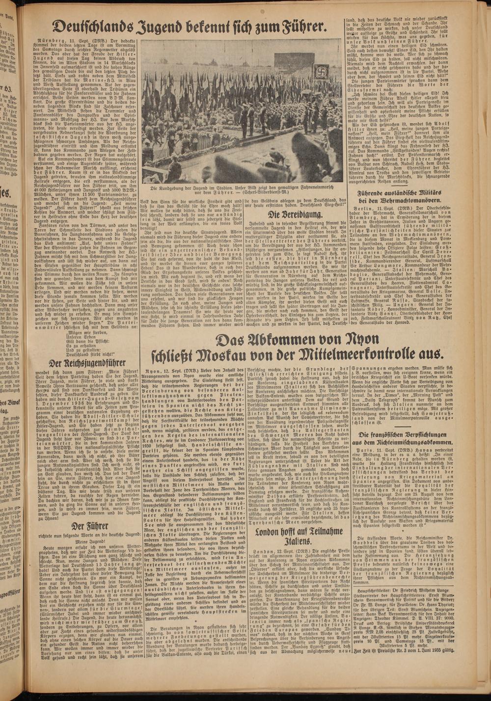 Als der Eid gesprochen ist, wendet sich Adolf Hitler ihnen zu: „Heil, meine jungen Parteigenossen!" „Heil, mein Führer'" donnert ihm als Antwort entgegen. Das Sieg-Heil des Reichsjugendführers auf Den Führer findet ein vieltausendstimmiges Echo. Dann klingt das Fahnenlied der HI. auf. Das Kommando „Stillgestanden! Augen rechts! Fahnen hoch!" ertönt. Der Präsentiermarsch er- klingt, und nun schreitet der Führer, begleitet von Baldur von Schirach, Rudolf Heß, dem Stabsführer Lauterbacher, dem Ehrenführer der HI. Admiral von Trotha und den jeweiligen Gebiets- führern durch die Marschblocks, die schnurgerade ausgerichteten Reihen entlang.