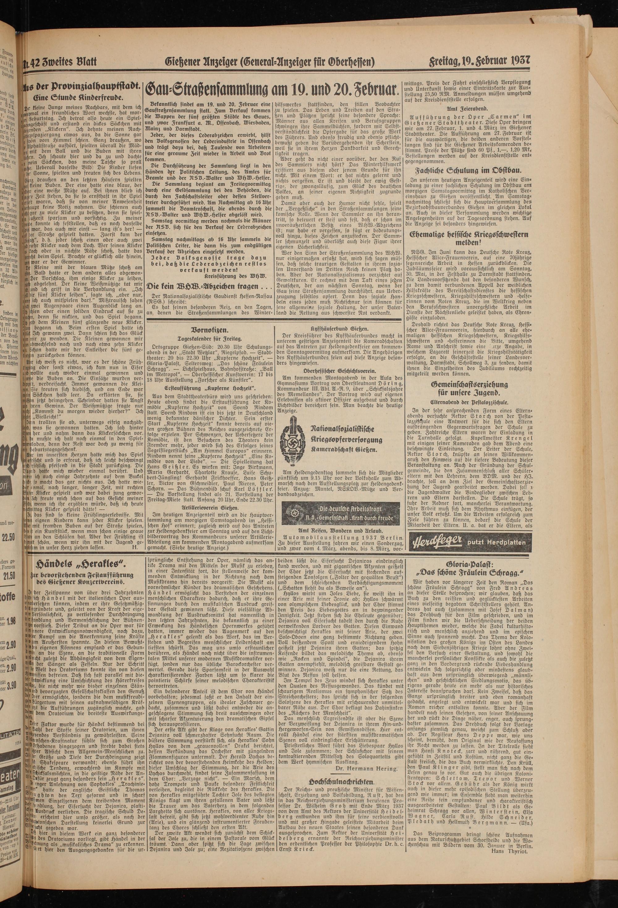 Ortsgruppe Gießen-Süd: 20.30 Uhr Schulungsabend in der „Stadt Wetzlar", Riegelpfad. — Stadttheater: 20 bis 22.30 Uhr „Kupferne Hochzeit". — Gloria-Palast, Seltersweg: „Das schöne Fräulein Schragg". — Lichtspielhaus, Bahnhofstraße: „Ball im Metropol". — Oberhessischer Kunstverein: 17 bis 18 Uhr Ausstellung „Forscher als Künstler".