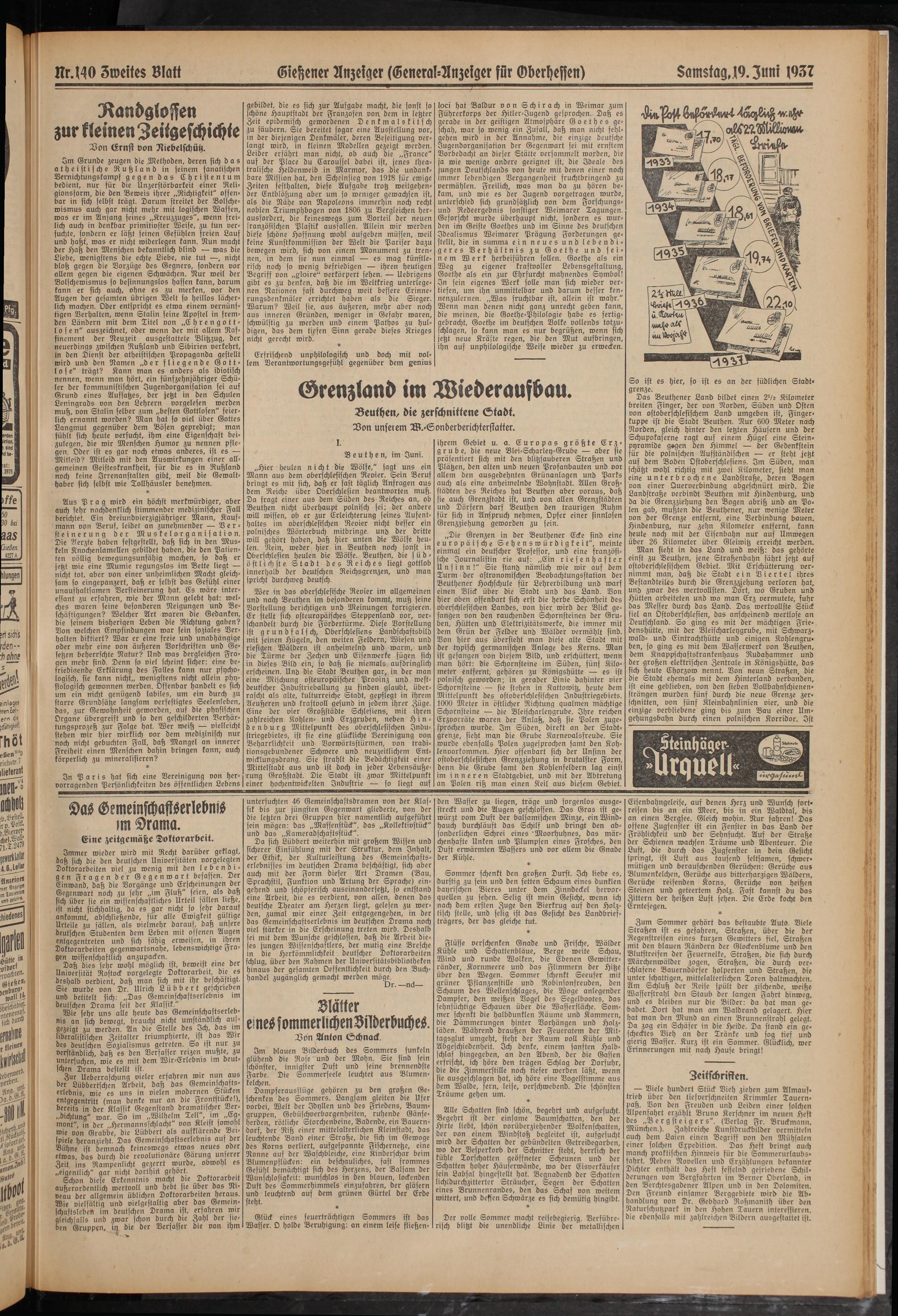 ihrem Gebiet u. a. Europas größte Erzgrube, die neue Blei-Scharley-Grube — aber sie präsentiert sich mit den blitzsauberen Straßen und Plätzen, den alten und neuen Profanbauten und vor allem den ausgedehnten Grünanlagen und Parks auch als eine anheimelnde Wohnstadt. Allen Großstädten des Reiches hat Beuthen aber voraus, daß sie auch Grenzstadt ist, und von allen Grenzstädten und Dörfern darf Beuthen den traurigen Ruhm für sich in Anspruch nehmen, Opfer einer sinnlosen Grenzziehung geworden zu sein.