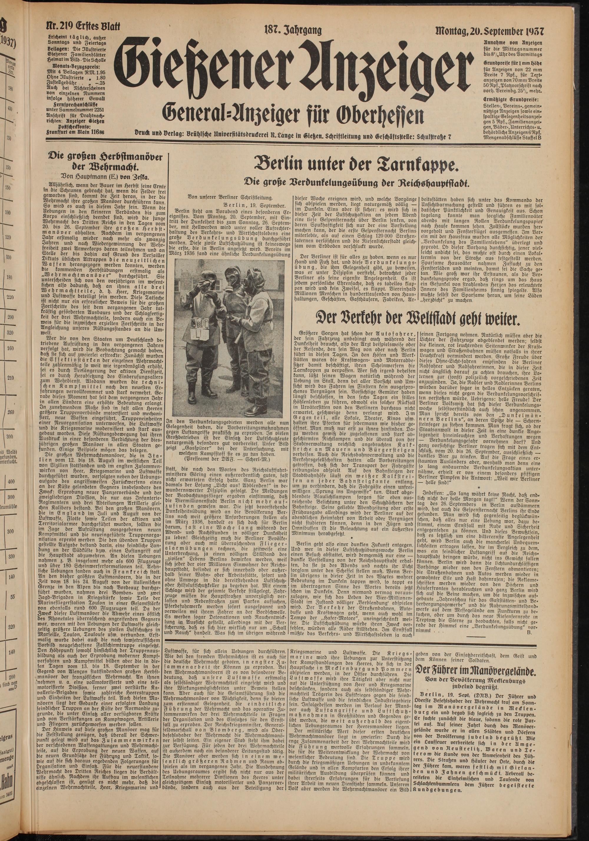 Berlin steht am Vorabend eines besonderen Ereignisses. Vom Montag, 20. September, mit Eintritt der Dunkelheit bis zum Sonntag, 26. September, mit Hellwerden wird unter voller Aufrechterhaltung des Verkehrs- und Wirtschaftslebens eine große Derdunkelungsübung durchgeführt werden. Diese zivile Luftschutzübung ist keineswegs die erste, die m Berlin angesetzt wird. Bereits im März 1936 fand eine ähnliche Verdunkelungsübung