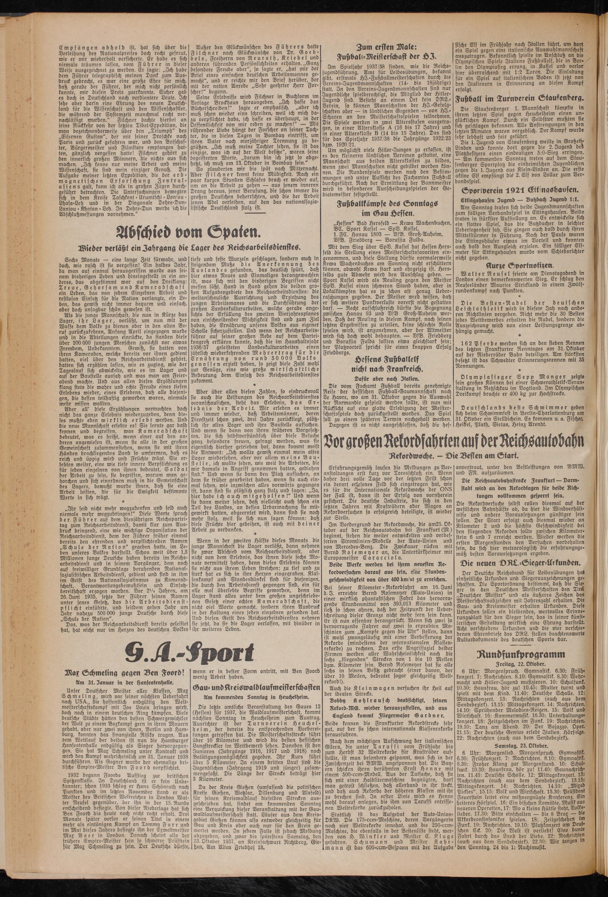 Im Spieljahr 1937/38 finden, wie die Reichsjugendführung, Amt für Leibesübungen, bekannt gibt, erstmals HJ.-Fußballmeisterfchaften durch die Vereins-Jugendmannschaften (14= bis 18 jährige) statt. In den Vereins-Jugendmannschaiten sind nur Jugendliche spielberechtigt, die Mitglied der Hitler- Jugend sind. Besteht an einem Ort kein DRL.- Verein, so können Mannschaften der HJ.-Gefolg- chaften oder — in ländlichen Gegenden — von HJ.- Scharen an den Meisterschaftsspielen teilnehmen. Die Spiele werden in zwei Altersstufen ausgetragen, in einer Altersklasse A (16 bis 17 Jahre) und in einer Altersklasse B (14 bis 15 Jahre). Das sind ür das Spieljahr 1937/38 die Jahrgänge 1922/23 bzw. 1920/21.