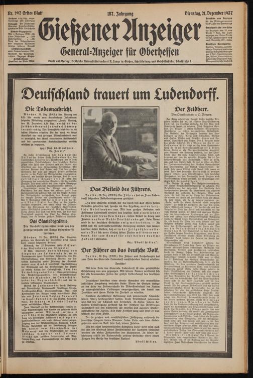 Mit dem Tode des Generals Ludendorff ist eine geschichtliche Erscheinung von uns gegangen. Mit feinem Kamen verbindet sich für alle kommenden Zeiten der größte Heldenkampf des deutschen Volkes.
