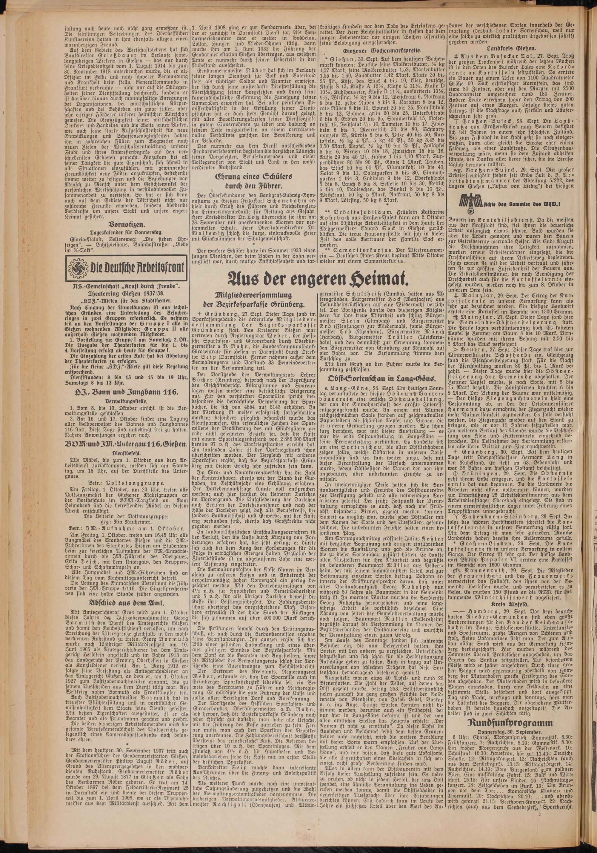 Am Freitag, 1. Oktober, treten um 16.45 Uhr alle Jungmädel des Standortes Gießen und die JM.- Führerinnen des Standortes Gießen am Studentenheim zur feierlichen Aufnahme der IM.-Anwärterinnen durch die IM.-Führerin des Obergaues, Erika D e s ch, mit dem Untergau-, den Gruppen-, Schar- und Schaftswimpeln an.