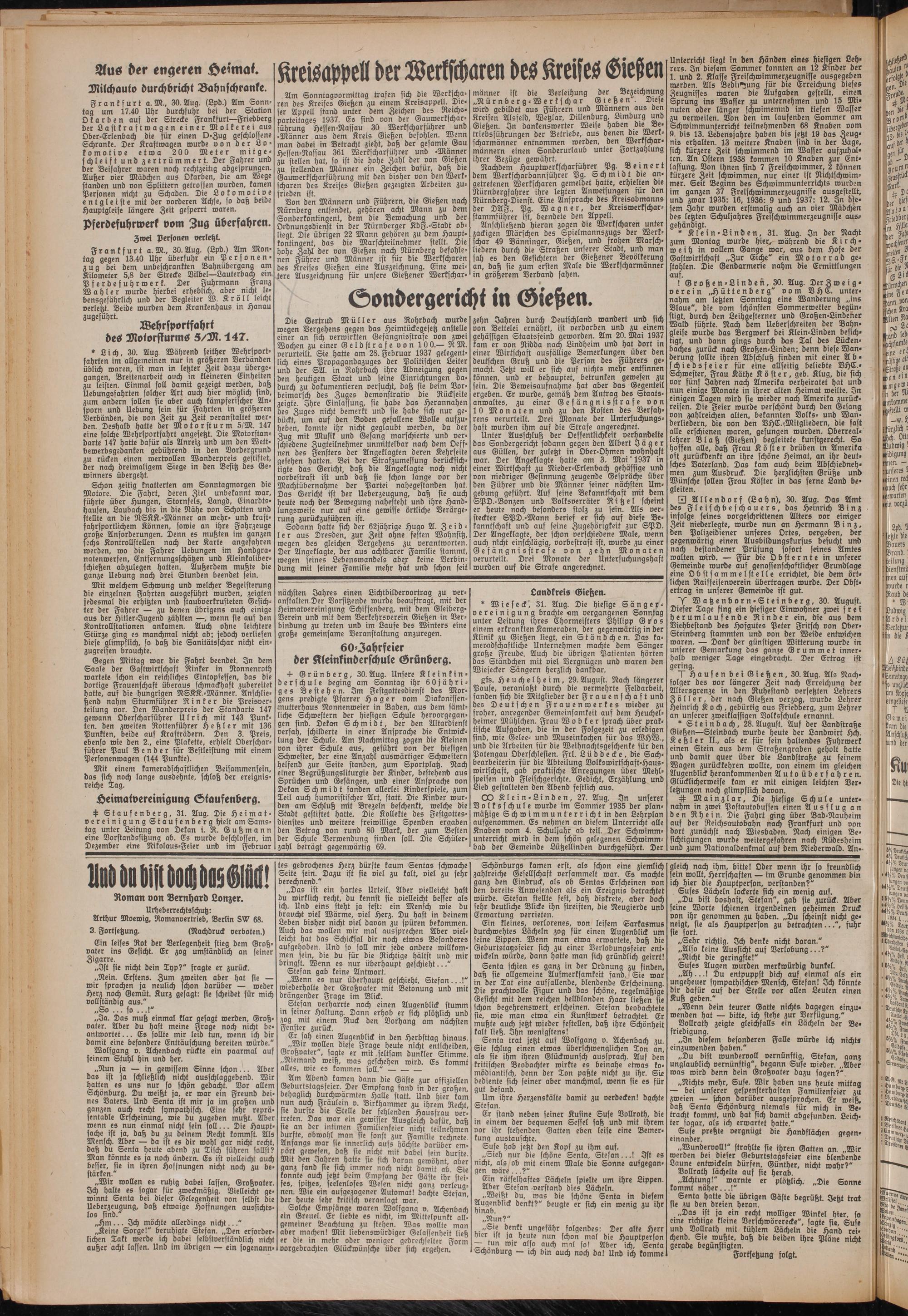 Von den Männern und Führern, die Gießen nach Nürnberg entsendet, gehören acht Mann zu dem Sonderkontingent, dem die Bewachung und der Ordnungsdienst in der Nürnberger KdF.-Stadt obliegt. Die übrigen 22 Mann gehören zu dem Haupt- kontingent, das die Marschteilnehmer stellt. Die hohe Zahl der von Gießen nach Nürnberg befohlenen Führer und Männer ist für die Werkscharen des Kreises Gießen eine Auszeichnung. Eine weitere Auszeichnung für unsere Gießener Werkschar