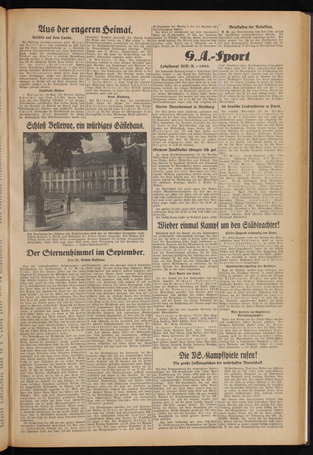 Auch die Paddler werden dazu beitragen, den Opfertag des Deutschen Sportes zu einem schönen Erfolg zu gestalten. So geht es unter der Leitung der Paddlergilde Gießen und unter Beteiligung der den Gießener Rudervereinen ange» schlossenen Paddler um die Stadtmeisterschaft im Einer-Wonder-Faltboot, ferner wird ein Rennen im Einer-Wander-Faltboot für die Altersklasse über 32 Jahre gestartet. Außerdem steht ein Rennen um die Stadtmeisterschaft im Zweier- Wander-Faltboot bevor, an dem sich die den Vereinen angehörenden Paddler der Stadt Gießen beteiligen können. Auch für die Altersklasse wird ein Rennen im Zweier-Wander-Faltboot ausgetragen.