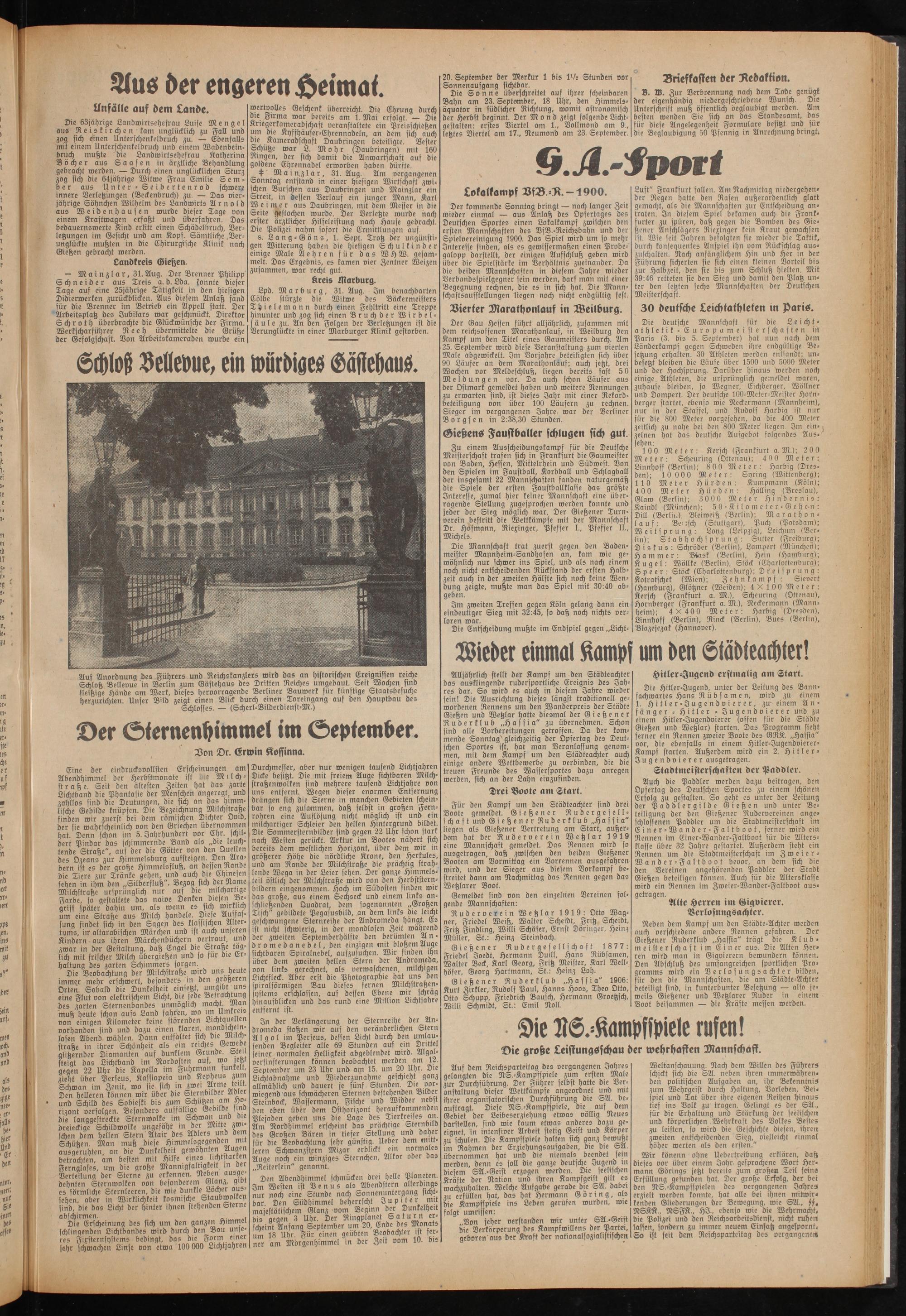 Auf dem Reichsparteitag des vergangenen Jahres gelangten die NS.-Kampffpiele zum ersten Male zur Durchführung. Der Führer selbst hatte die Veranstaltung dieser Wettkämpfe angeordnet und mit ihrer organisatorischen Durchführung die SA. beauftragt. Diese NS.-Kampfspiele, die auf dem Gebiet der Leibeserziehung etwas völlig Neues darstellen, sind wie kaum etwas anderes dazu geeignet, in intensiver Arbeit stetig Geist und Körper zu schulen. Die Kampfspiele halten sich ganz bewußt im Rahmen der Erziehungsaufgaben, die die SA. übernommen hat und die niemals beendet sein werden, denn es soll die ganze deutsche Jugend in diesem SA.-Geist erzogen werden. Die seelischen Kräfte der Nation und ihren Kampfgeist gilt es wachzuhalten. Welche Aufgabe gerade die SA. dabei zu erfüllen hat, das hat Hermann Göring, als die Kampfspiele ins Leben gerufen wurden, wie folgt umrissen: