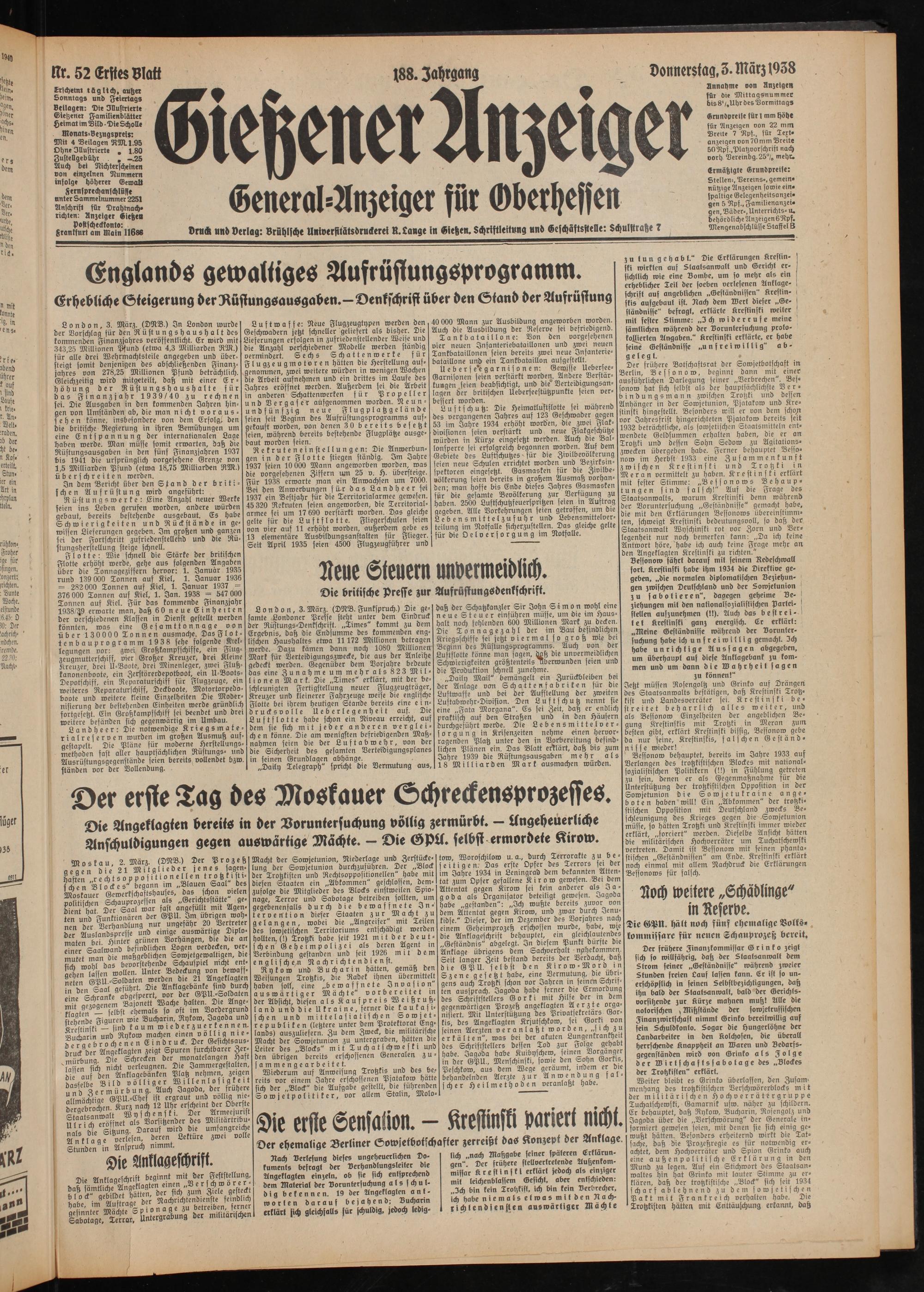 Bessonow behauptet, bereits im Jahre 1933 auf Verlangen des trotzkistischen Blockes mit nationalsozialistischen Polittkern (!!) in Fühlung getreten zu sein, denen er als Gegenmaßnahme für die Unterstützung der trotzkisttschen Opposition in der Sowjetunion di e Sowjetukraine angeboten haben will! Ein „Abkommen" der trotzkistischen Opposition mit Deutschland zwecks Beschleunigung des Krieges gegen die Sowjetunion müsse, so hätten Trotzki und Krestinski immer wieder erklärt, „forciert" werden. Dieselbe Ansicht hätten die militärischen Hochverräter um Tuchatschewski vertreten. Damit ist Bessonow mit seinen phantastischen „Geständnissen" am Ende. Krestinski erklärt noch einmal mit allem Nachdruck die Erklärungen Bessonows für falsch.