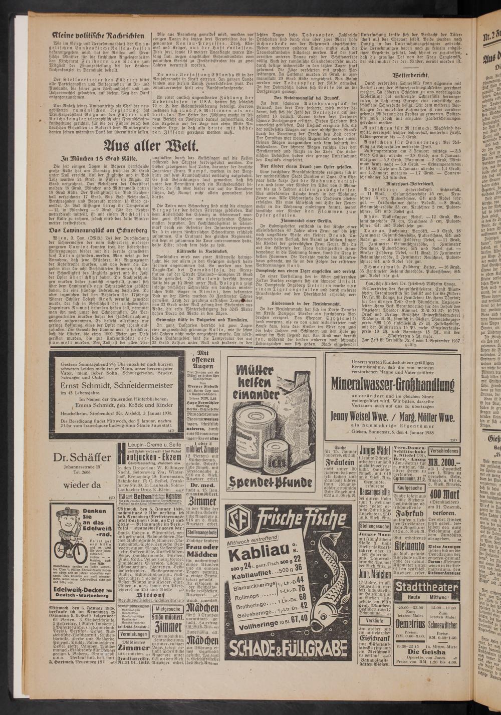 Hauptschriftleiter: Dr. Friedrich Wilhelm Lange. Stellvertreter des Hauptschristleiters: Ernst Blumschein. Verantwortlich für Politik und für die Bilder^ Dr. Fr. W. Lange; für Feuilleton: Dr. Hans Tyyriot; für den übrigen Teil: Ernst Blumschein. Anzeigenleiter: Hans Beck. Verantwortlich für den Inhalt der Anzeigen: Theodor Kümmel. D. 21. XI. 37: 10 780. Druck und Verlag: Brühlsche Universitätsdruckerei R. Lange, K.-G., sämtlich in Gießen. Monatsbezugs- preis RM. 2,05 einschließlich 25 Pf. Zustellgebühr, mit der Illustrierten 15 Pf. mehr. Einzelverkaufs- preis 10 Pf. und Samstags 15 Pf., mit der