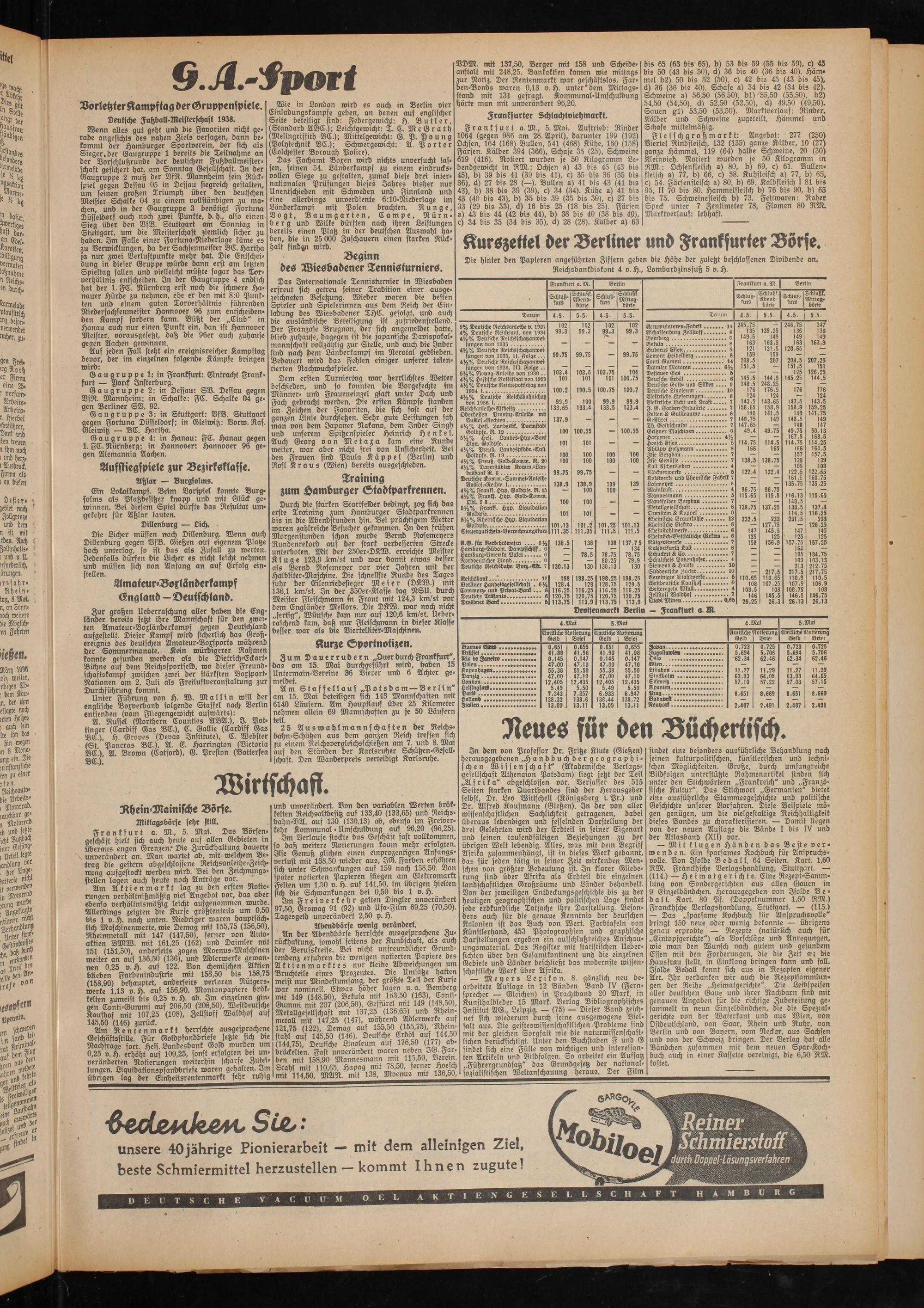 Frankfurt a. M., 5. Mai. Auftrieb: Rinder 1064 (gegen 986 am 28. April), darunter 199 (192) Ochsen, 164 (168) Bullen, 541 (468) Kühe, 160 (158) Färsen. Kälber 394 (366), Schafe 35 (25), Schweine