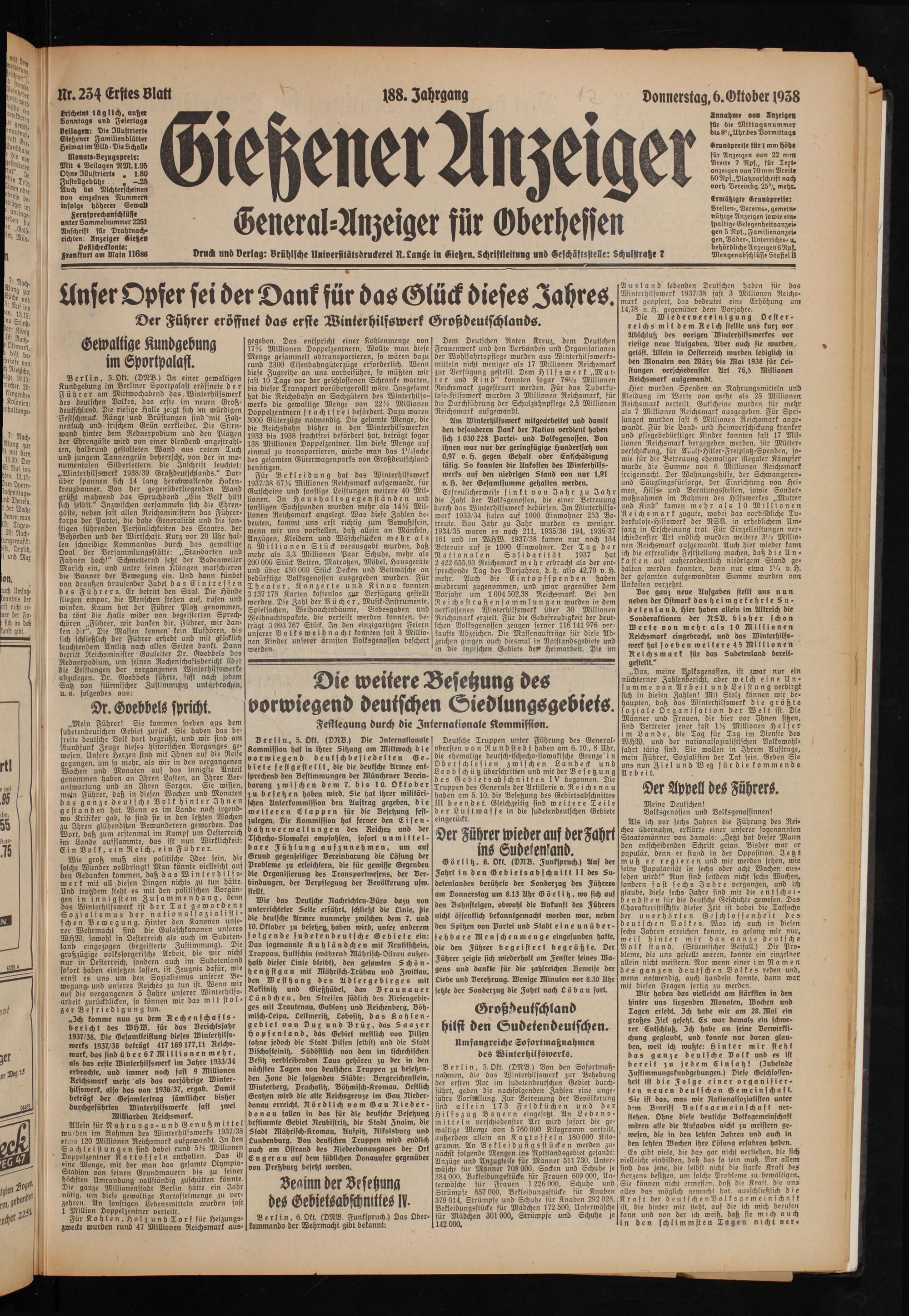 „Mein Führer! Sie kommen soeben aus dem sudetendeutschen Gebiet zurück. Sie haben das befreite deutsche Volk dort begrüßt, und wir sind am Rundfunk Zeuge dieses historischen Vorganges gewesen. Unsere Herzen sind mit Ihnen auf die Reise gegangen, um so mehr, als wir in den vergangenen Wochen und Monaten auf das innigste Anteil genommen haben an Ihren Lasten, an Ihrer Verantwortung und an Ihren Sorgen. Sie wissen, mein Führer, daß in diesen Wochen und Monaten das ganze deutsche Volk hinter Ihnen gestanden hat. Wenn es im Lande noch irgendwo Kritiker gab, so sind sie in den letzten Wochen zu Ihren glühendsten Bewunderern geworden. Das Wort, daß zum erstenmal im Kampf um Oesterreich im Lande aufflammte, das ist nun Wirklichkeit: Ein Volk, ein Reich, ein Führer.