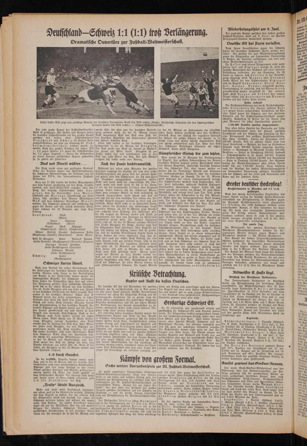Die Reichssportführung hat durch Reichsfachamtsleiter Linnemann den Spieler Johann Pes- s e r wegen seines unsportlichen Verhaltens im Pariser Spiel gegen die Schweiz von den weiteren Kämpfen um die Fußballweltmeisterschaft ausgeschlossen. Außerdem ist Pesser für die Dauer von zwei Monaten für jeden Sportverkehr gesperrt.
