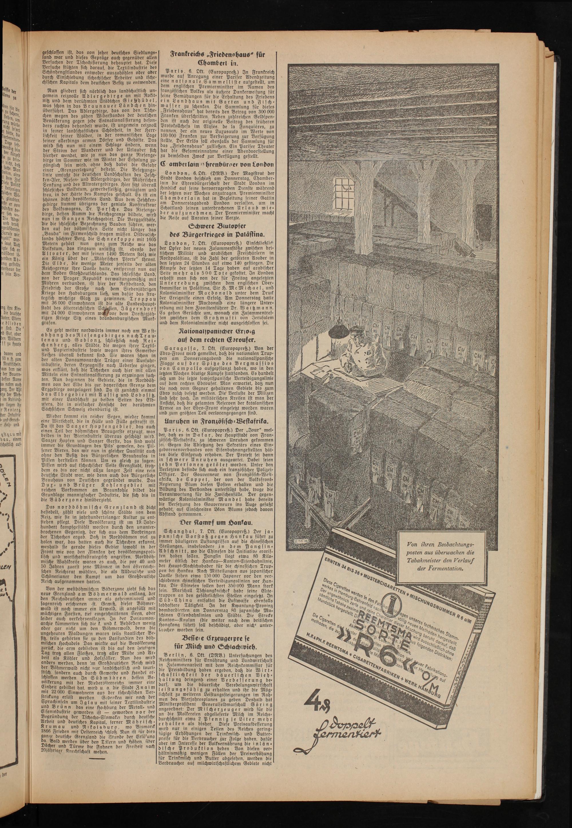 Wieder kommt ein reicher Segen, wieder kommt eine Wirtschaft, die in Hülle und Fülle gestrafft ist. Da ist das Saazer H o p f e n g e b i e t, das auch einen Teil der böhmischen Braugerste erzeugt, was beides in del Bierindustrie überaus geschätzt wird. Saazer Hopsen und Saazer Gerste, das sind wohl immer die Grundlagen des Pils' gewesen, des Pilsener Bieres, das wir nun in gleicher Qualität auch ohne den Besitz des Bürgerlichen Brauhauses in Pilsen herstellen können. Um es gleich zu sagen: Pilsen wird auf tschechischer Seite Grenzstadt, trotzdem es bis vor nicht allzu langer Zeit eine rein deutsche Stadt war, wie denn auch das Bürgerliche Brauhaus von Deutschen gegründet wurde. Das Dux- und Brüxer Kohlengebiet mit reichen Vorkommen an Braunkohle bildet die Grundlage mannigfacher Industrie, die sich bis in die Bäderzone hinüberzieht.