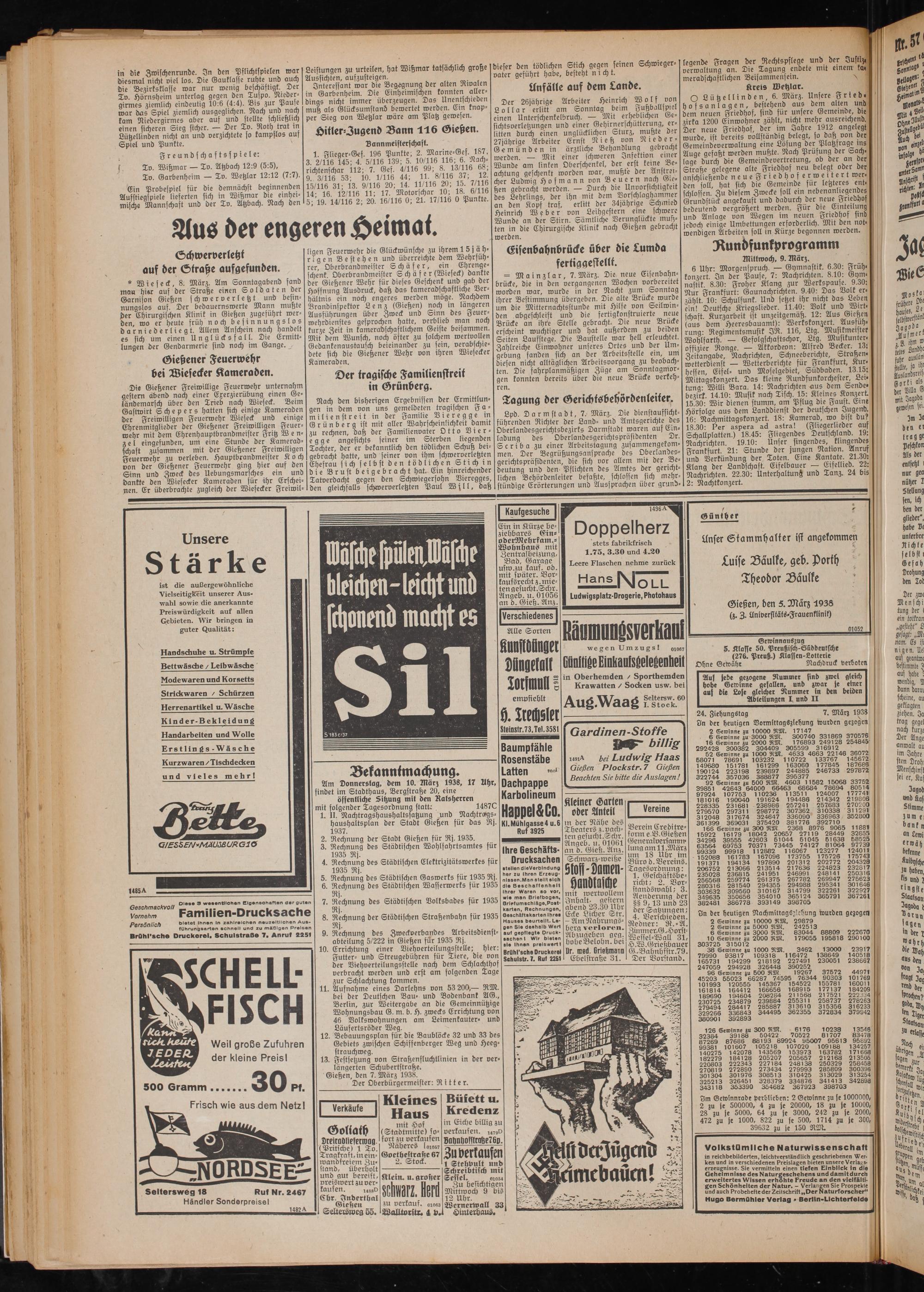 * Wie se ck, 8. März. Am Sonntagabend fand matt hin auf der Straße einen Soldaten der Garnison Gießen schwerverletzt und besinnungslos auf. Der bedauernswerte Mann mußte der Chirurgischen Klinik in Gießen zugeführt werden, wo er heute früh noch besinnungslos d a r n i e d e r l i e g t. Allem Anschein nach handelt es sich um einen Unglücksfall. Die Ermittlungen der Gendarmerie sind noch im Gange.