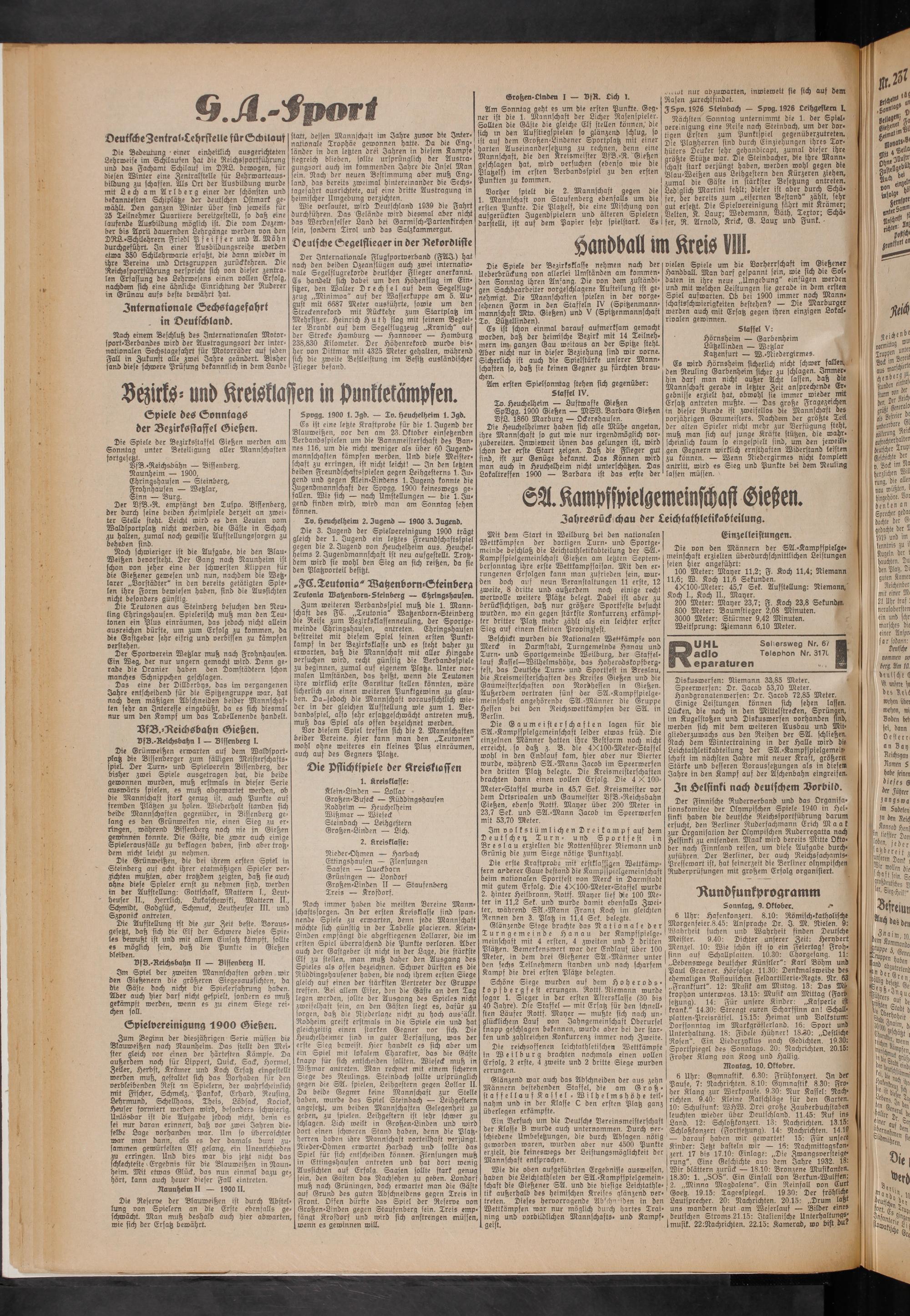Die Gaumeisterschaften lagen für die SA.-Kampfspielgemeinschaft leider etwas früh. Die einzelnen Männer hatten ihre Bestform noch nicht erreicht, so daß z. B. die 4X100-Meter-Staffel wohl in den Endlauf kam, hier aber nur Vierter wurde, während SA.-Mann Jacob im Speerwerfen den dritten Platz belegte. Die Kreismeisterschaften brachten dann einen vollen Erfolg. Die 4 X100- Meter-Stafiel wurde in 45,7 Sek. Kreismeister vor dem Ortsrioalen und Gaumeister VfB.-Reichsbahn Gießen, ebenso Rottf. Mayer über 200 Meter in 23,7 Sek. und SA.-Mann Jacob im Speerwerfen mit 53,70 Meter.