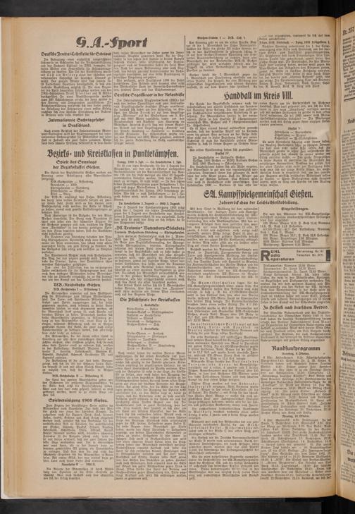 Glänzende Siege brachte das Nationale der Turngemeinde Hanau der Kampfspielgemeinschaft mit 4 ersten, 4 zweiten und 2 dritten Plätzen. Bemerkenswert war der Endlauf über 100 Meter, in dem drei Gießener SA.-Männer unter den sechs Teilnehmern standen und nach scharfem Kampf die drei ersten Plätze belegten.