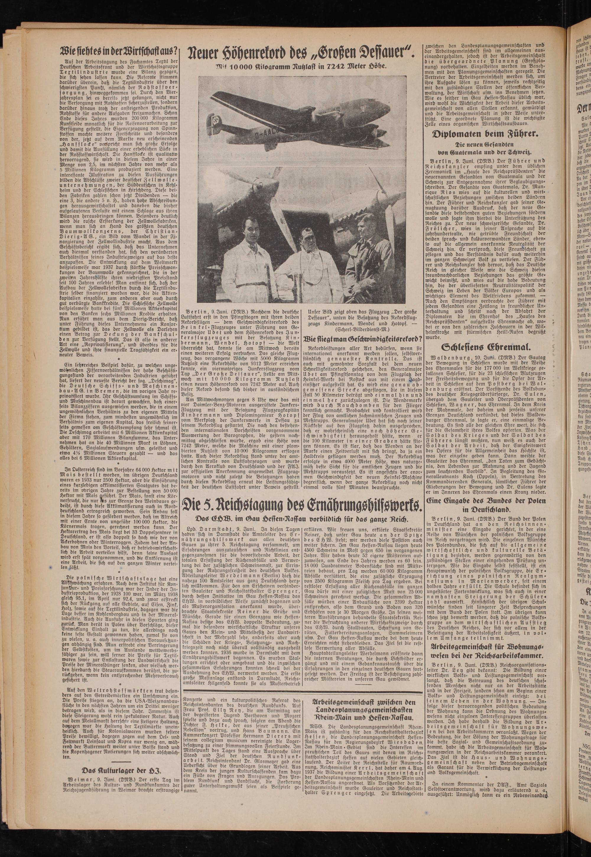 Am Mittwochmorgen gegen 8 Uhr war das mit vier Daimler-Benz-Motoren ausgerüstete Junkers- Flugzeug mit der Besatzung Flugzeugkapitän Kindermann und Diplomingenieur Hotopf vom Werkplatz der Junkerswerke in Dessau zu einem Rekordflug gestartet. Die nach den bestehenden internationalen Vorschriften oorgenommene Auswertung der Barographen, die gestern nachmittag abgeschlossen wurde, ergab eine Höhe von 7242 Meter, welche die Maschine mit einer plombierten Nutzlast von 10 000 Kilogramm erflogen hatte. Auch dieser Rekordflug stand unter der amtlichen Kontrolle von Luftfahrzeugen und wurde durch den Aeroklub von Deutschland und der FAJ. zur offiziellen Anerkennung angemeldet. Flugzeugmotoren und nicht zuletzt die Besatzungen haben durch diesen Rekordflug erneut die Leistungsfähigkeit der deutschen Luftfahrt unter Beweis gestellt.