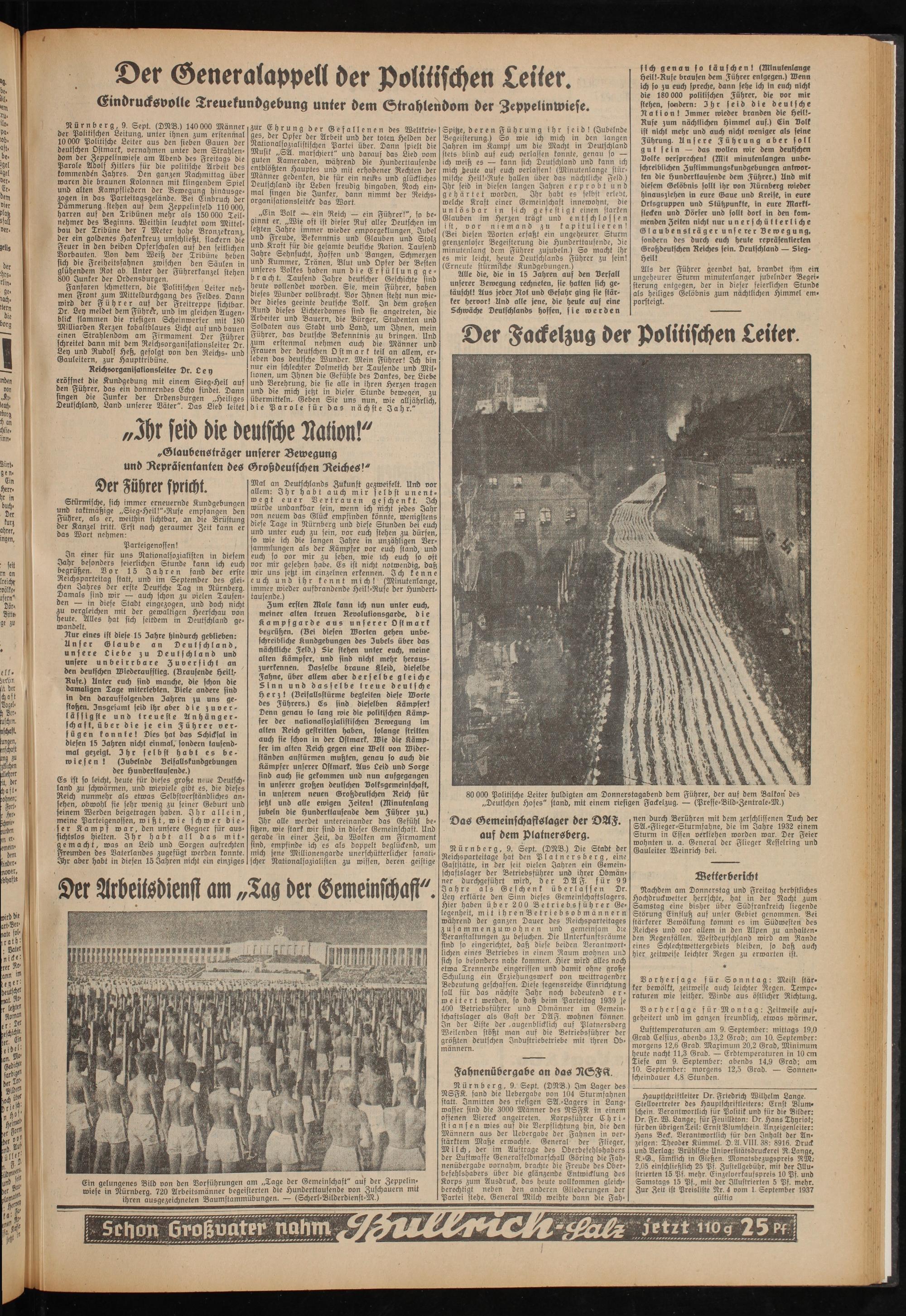 Mal an Deutschlands Zukunft gezweifelt. Und vor allem: Ihr habt auch mir selbst unent- weat euer Vertrauen geschenkt. Ich würde undankbar sein, wenn ich Nicht jedes Jahr von neuem das Glück empfinden könnte, wenigstens diese Tage in Nürnberg und diese Stunden bei euch und unter euch zu sein, vor euch stehen zu dürfen, so wie ich die langen Jahre in unzähligen Versammlungen als der Kämpfer vor euch stand, und euch so vor mir zu sehen, wie ich euch so oft vor mir gesehen habe. Es ist nicht notwendig, daß wir uns letzt im einzelnen erkennen. Ich kenne euch und ihr kennt mich! (Minutenlange, immer wieder aufbrandende Heil!-Rufe der Hundert- tausende.)