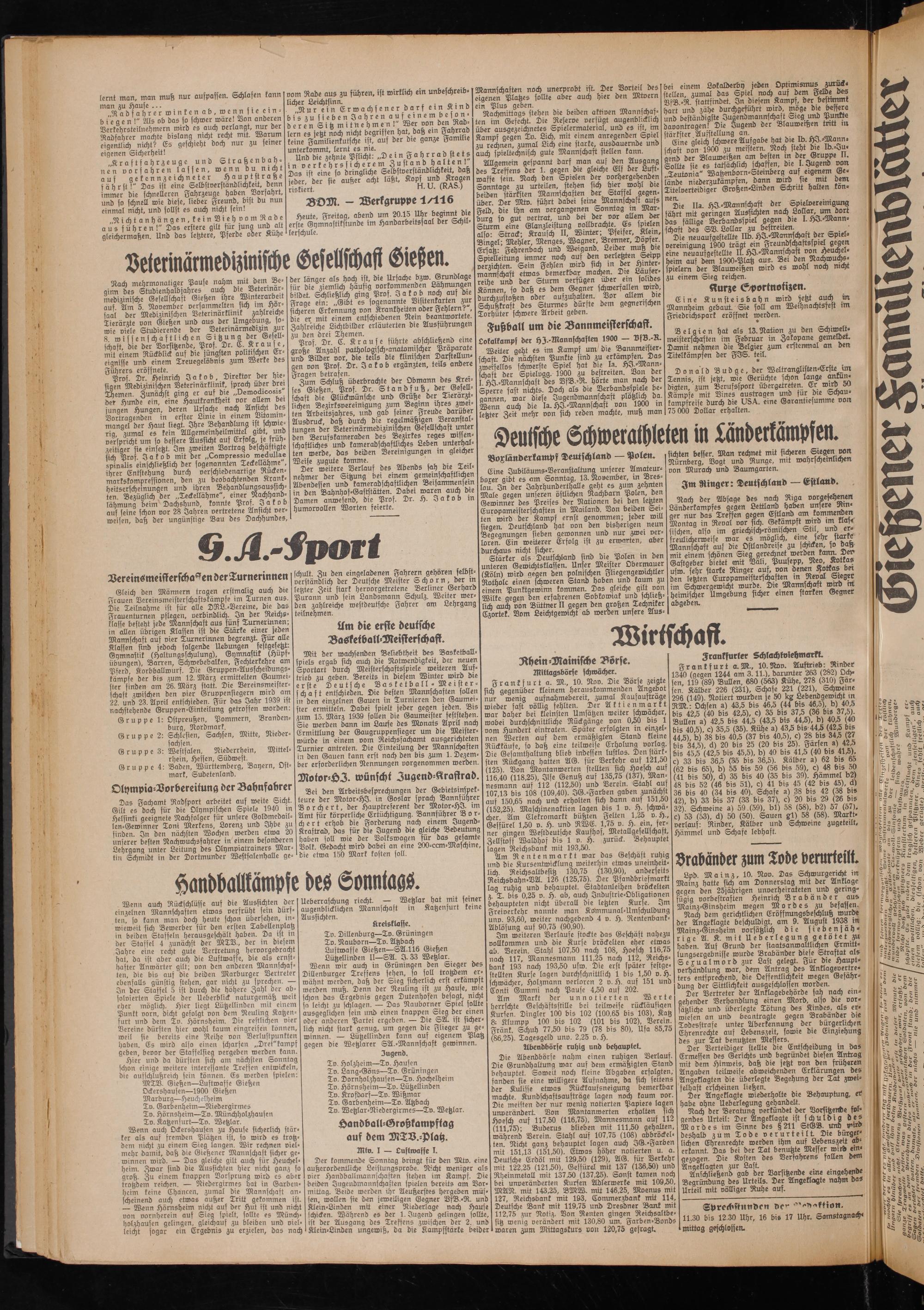 Mit der wachsenden Beliebtheit des Basketballspiels ergab sich auch die Notwendigkell, der neuen Sportart durch Meisterschaftsspiele melieren Auftrieb zu geben. Bereits in diesem Winter wird die erste Deutsche Basketball - Mei st erschuft entschieden. Die besten Mannschaften sollen in den einzelnen Gauen in Turnieren den Gaumeisler ermitteln. Dabei spielt jeder gegen jeden. Bis zum 15. März 1939 sollen die Gaumeister feststehen. Sie werden dann im Laufe des Monats Aprll nach Ermittlung der Gaugruppensieger um die Meister- mürbe in einem vorn Reichsfachamt ausgerichteten Turnier antreten. Die Einteilung der Mannschaften in den Gauen kann erst nach ben bis zum 1. Dezember erforderlichen Nennungen vorgenommen werden. Motor-HZ. wünscht Jugend-Kraftrad.