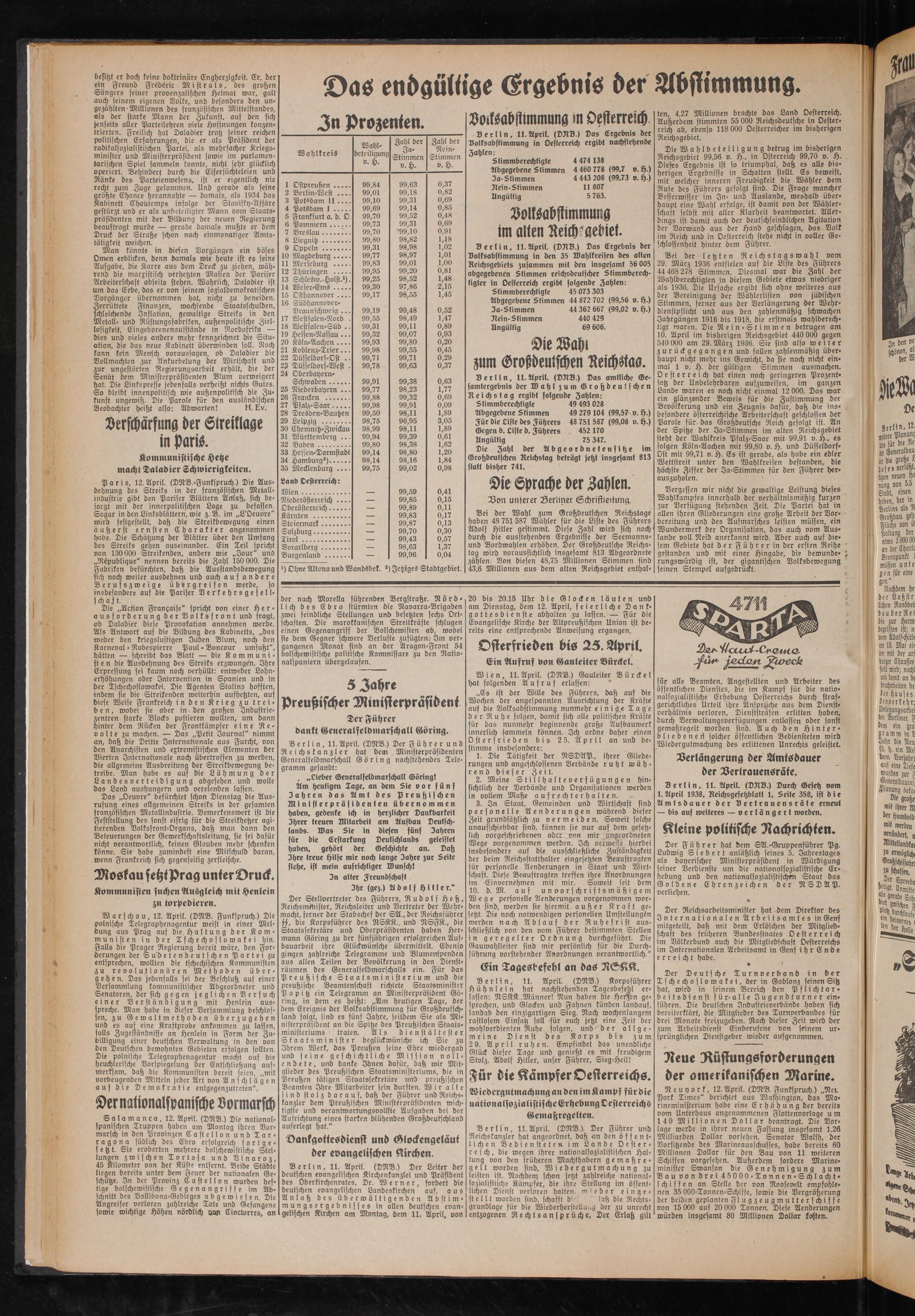 Bei der letzten Reichstagswahl vom 29. März 1936 entfielen auf die Lifte des Führers 44 468 278 Stimmen. Diesmal war die Zahl der Wahlberechtigten in diesem Gebiete etwas niedriger als 1936. Die Ursache ergibt sich ohne weiteres aus der Bereinigung der Wählerlisten von jüdischen Stimmen, ferner aus der Verlängerung der Wehrdienstpflicht und aus den zahlenmäßig schwachen Jahrgängen 1916 bis 1918, die erstmals wahlberechtigt waren. Die Nein-Stimmen betrugen am 10. April im bisherigen Reichsgebiet 440 000 gegen 540 000 am 29. März 1936. Sie sind also weiter zurückgegangen und fallen zahlenmäßig überhaupt nicht mehr ins Gewicht, da sie noch nicht einmal 1 v. H. der gültigen Stimmen ausmachen. Oesterreich hat einen noch geringeren Prozentsatz der Unbelehrbaren aufzuweisen, im ganzen Lande waren es noch nicht einmal 12 000. Das war ein glänzender Beweis für die Zustimmung der Bevölkerung und ein Zeugnis dafür, daß die insbesondere österreichische Arbeiterschaft geschlossen der Parole für das Großdeutsche Reich gefolgt ist. An der Spitze der Ja-Stimmen im alten Reichsgebiet steht der Wahlkreis Pfalz-Saar mit 99,91 v. H., es folgen Köln-Aachen mit 99,80 v. H. und Düffeldorf- Ost mit 99,71 v. H. Es ist gerade, als habe ein edler Wettstreit unter den Wahlkreisen bestanden, die höchste Ziffer der Ja-Stimmen für den Führer herauszuholen.