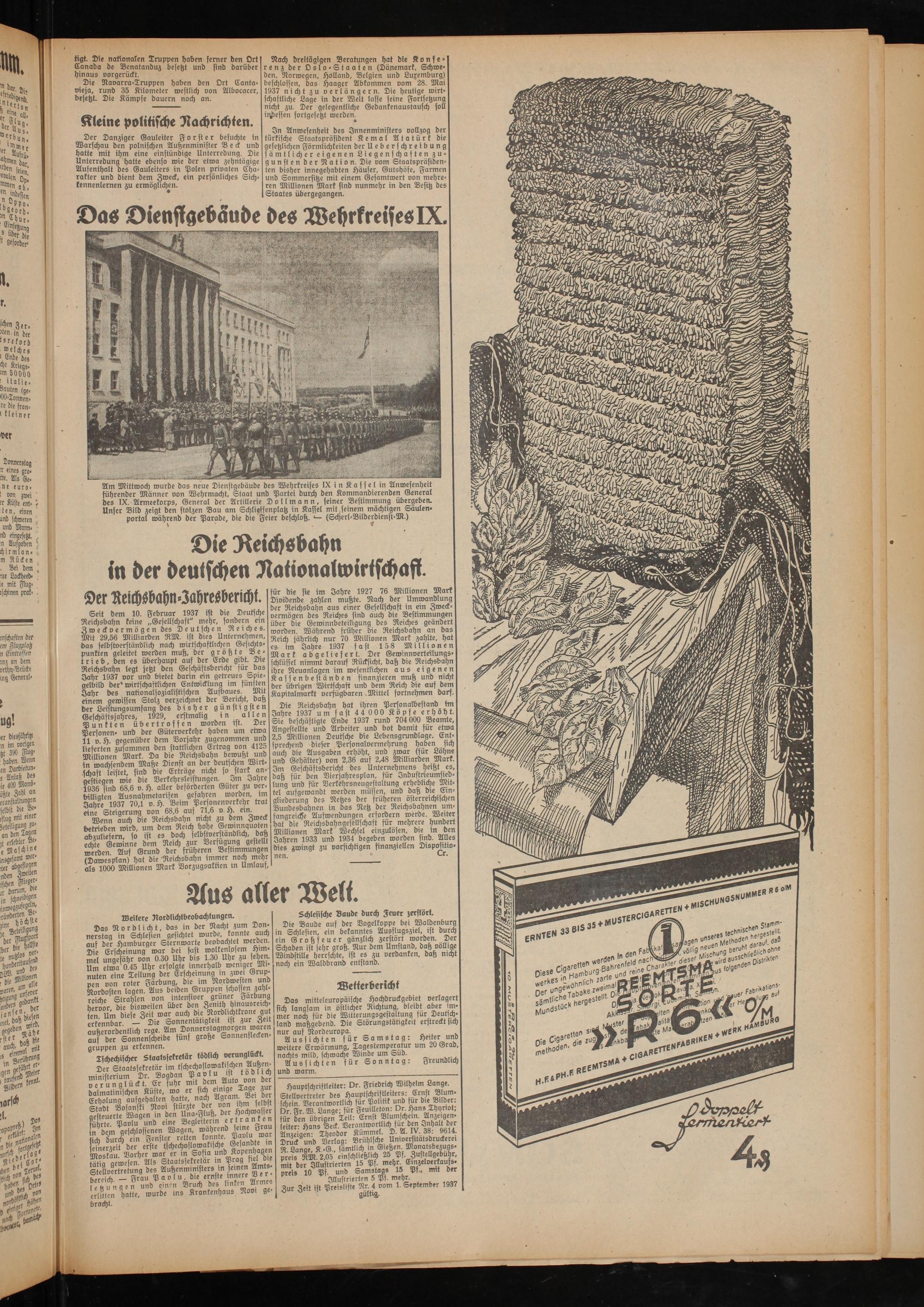 Hauptschriftleiter: Dr. Friedrich Wilhelm Lange. Stellvertreter des Hauptschriftleiters: Ernst Blum- schein. Verantwortlich für Politik und für die Bilder Dr. Fr. W. Lange; für Feuilleton: Or. Hans Thyriot; für den übrigen Teil: Ernst Blumschein. Anzeigenleiter: Hans Beck. Verantwortlich für den Inhalt der 2Imeiaen- Theodor Kümmel. D. A. IV. 38: 9614. W und Verlag: Brühlsche Univechtätsdruckerei R Lanae K -G sämtlich in Gießen. Monatsbezugs- preis RM 2M einschließlich 25 Pf Zustellgebühr, mit der Illustrierten 15 Ps mehr E'nz-lv-r °uss- nrels 10 Vs. und Samstags 15 Pf., mit Der