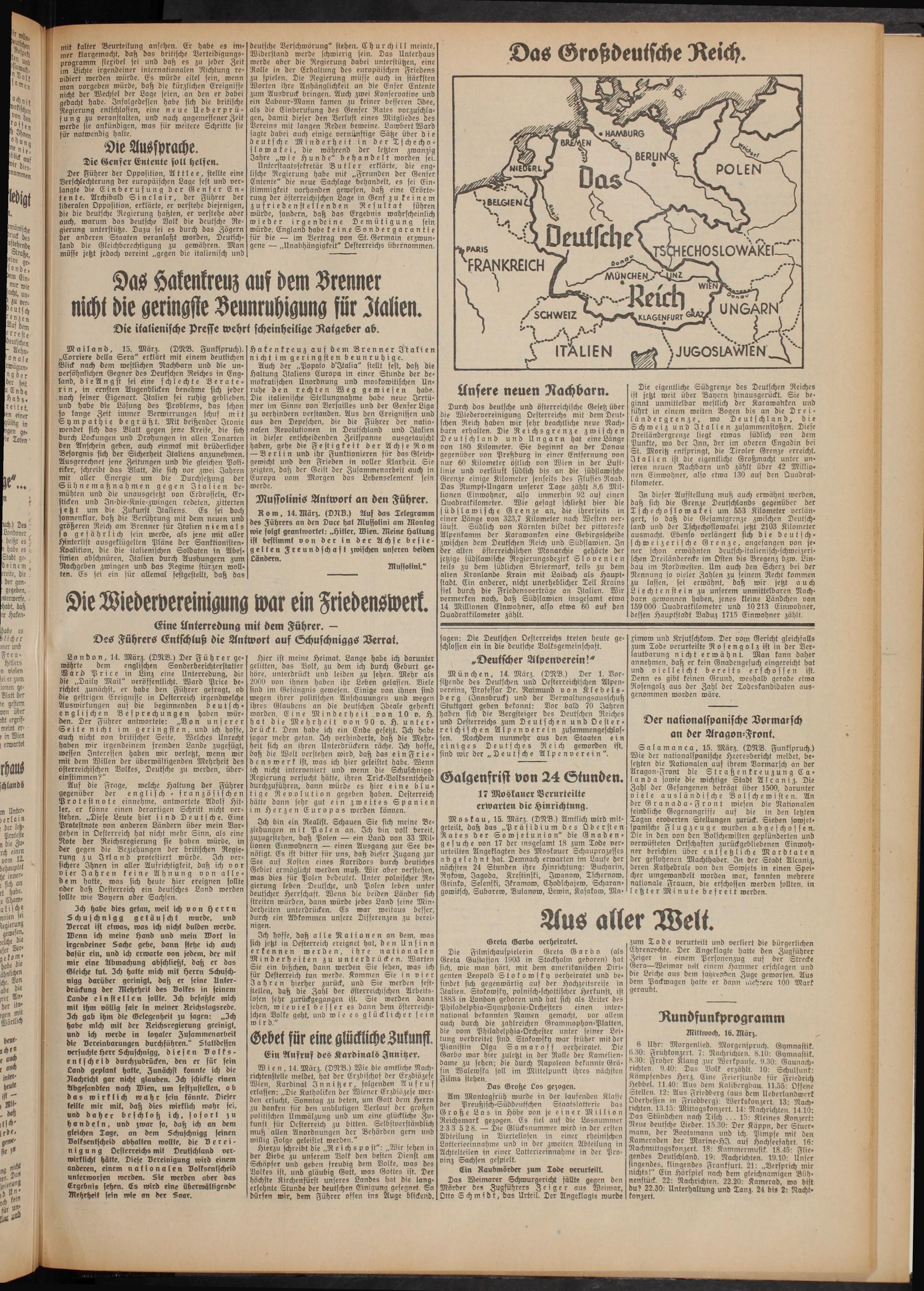Ich hoffe, daß alle Nationen an dem, was sich jetzt in Oesterreich ereignet hat, den Unsinn erkennen werden, ihre nationalen Minderheiten zu unterdrücken. Warten Sie ein bißchen, dann werden Sie sehen, was ich für Oesterreich tun werde. Kommen Sie in vier Jahren hierher zurück, und Sie werden feststellen, daß die Zahl der österreichischen Arbeitslosen sehr zurückgegangen ist. Sie werden dann sehen, wieviel besser es dann dem österreichischen Volke geht, und wie es glücklicher sein w i r d."