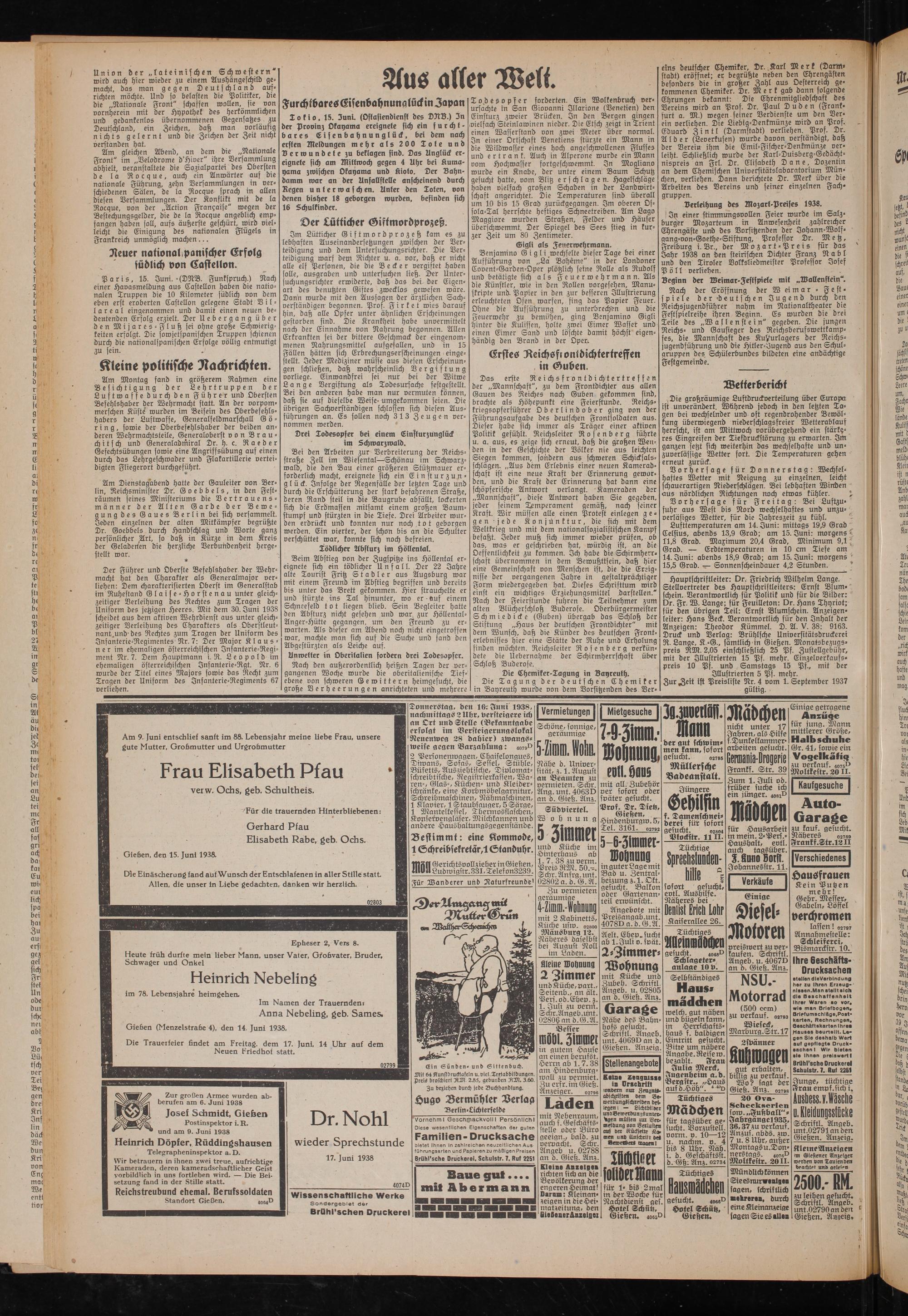 Hauptschriftleiter: Dr. Friedrich Wilhelm Lange. Stellvertreter des Hauptschriftleiters: Ernst Blumschein. Verantwortlich für Politik und für die Bilder: Dr. Fr. W. Lange; für Feuilleton: Dr. Hans Thyriot; für den übrigen Teil: Ernst Blumschein. Anzeigenleiter: Hans Beck. Verantwortlich für den Inhalt der Anzeigen: Theodor Kümmel. D. A. V. 38: 9163. Druck und Verlag: Brühlsche Universitätsdruckerei R. Lange, K -G, sämtlich in Gießen. Monatsbezugs- preis RM. 2,05 einschließlich 25 Pf. Zustellgebühr, mit der Illustrierten 15 Pf. mehr. Einzelverkauss- preis 10 Pf. und Samstags 15 Pf., mit der
