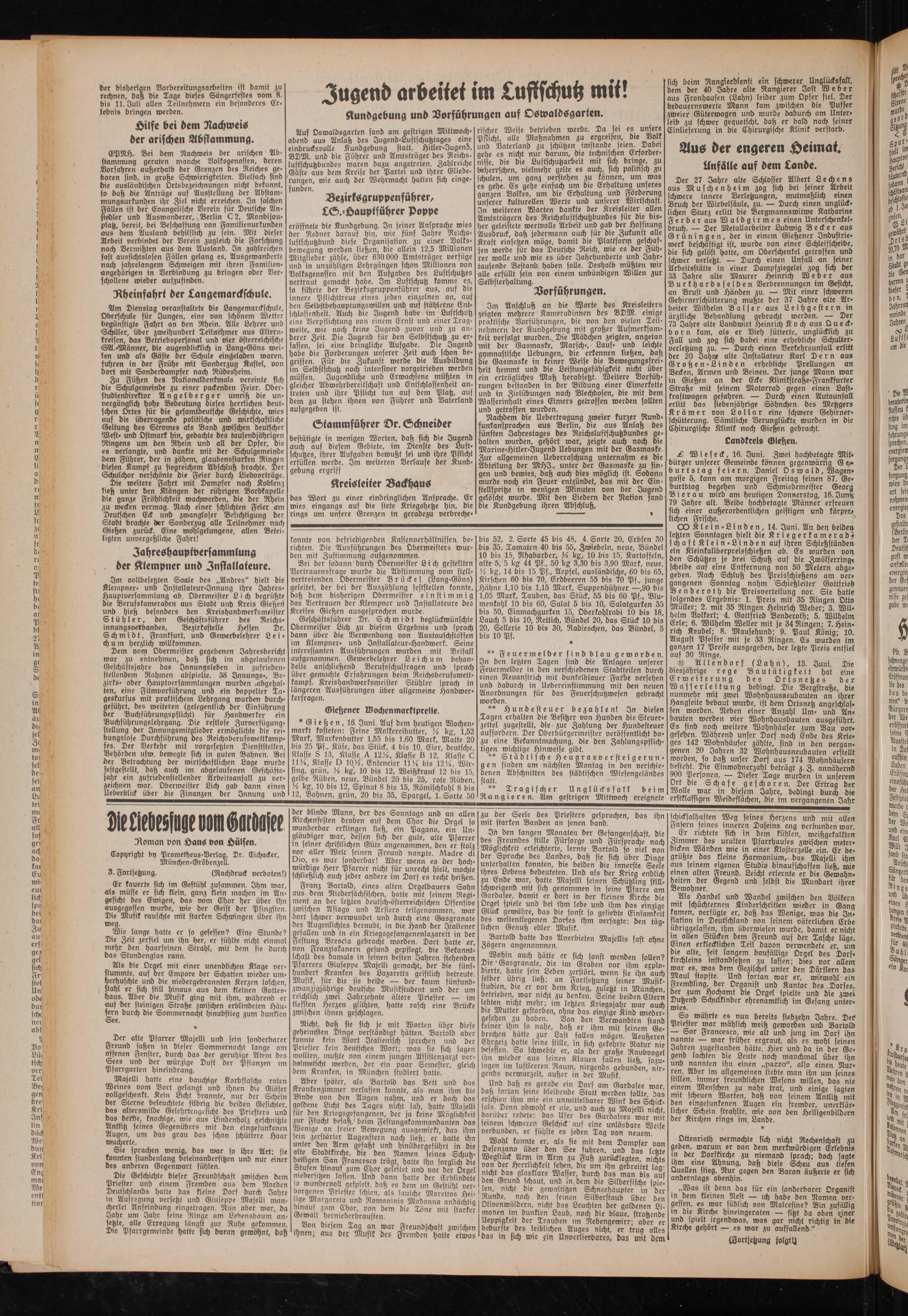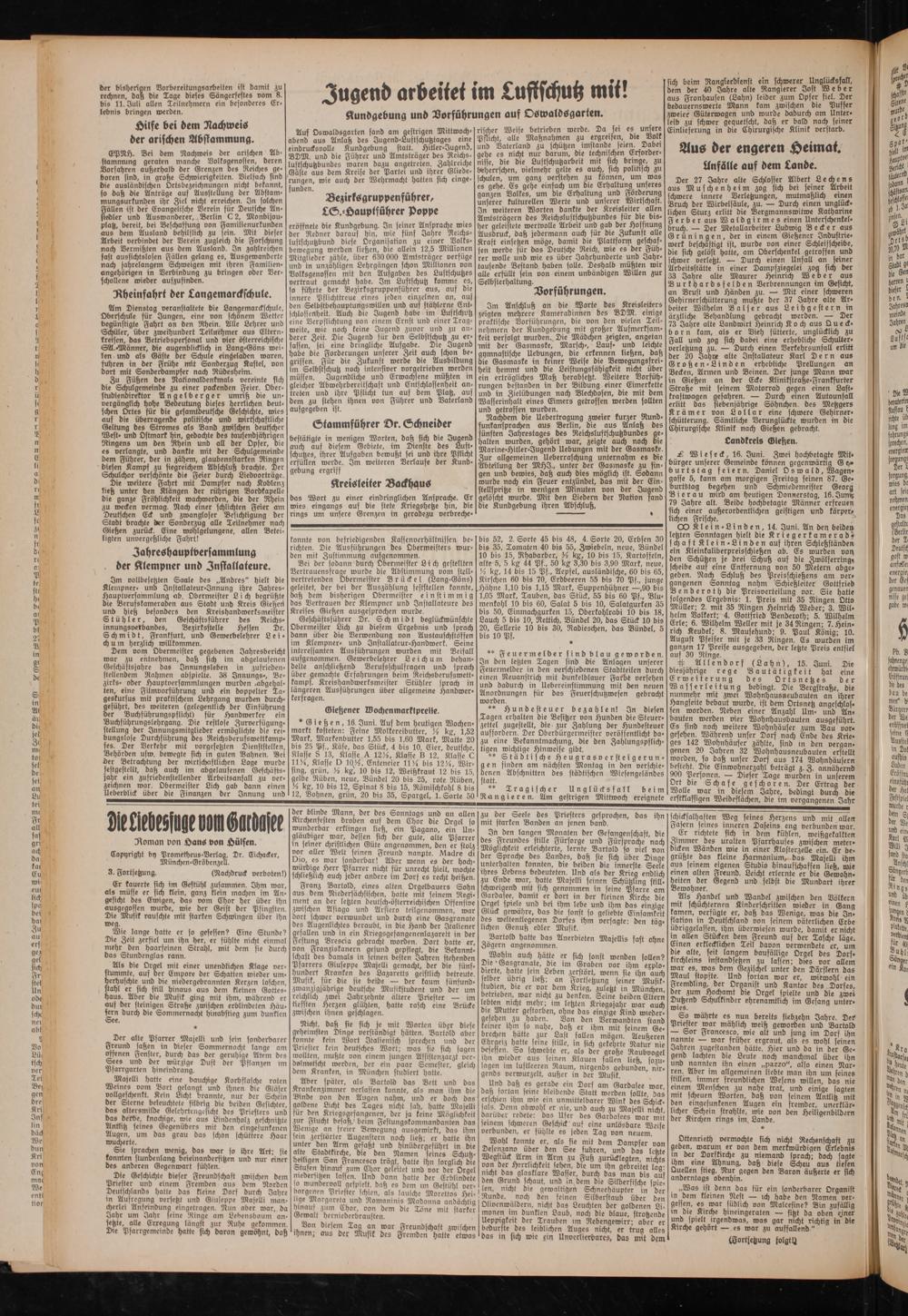 Am Dienstag veranstaltete die Langemarckschule, Oberschule für Jungen, eine von schönem Wetter begünstigte Fährt an den Rhein. Alle Lehrer und Schüler, über zweihundert Teilnehmer aus Eltern- kreisen, das Betriebspersonal und vier österreichische SA.-Männer, die augenblicklich in Lang-Göns weilen und als Gäste der Schule ringelnden waren, führen in der Frühe mit Sonderzua Kastel, von dort mit Sonderdampfer nach Rüdesheim.