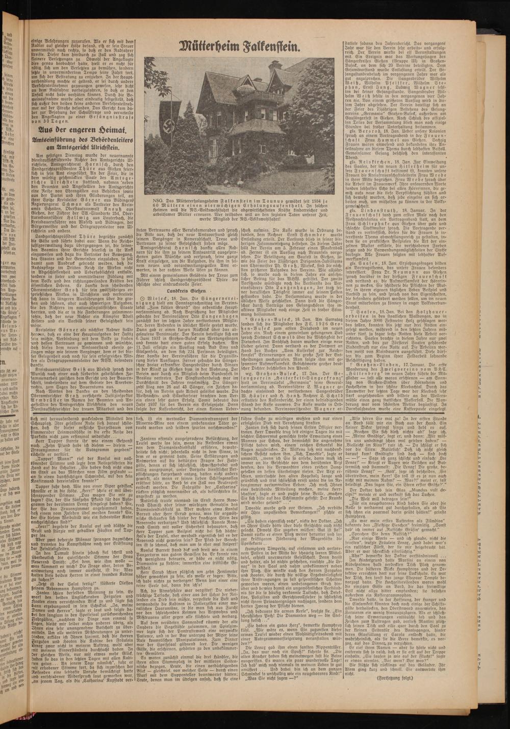 NSG. Das Müttererholungsheim Falken st ein im Taunus gewährt seit 1934 j e 60 Müttern einen vierwöchigen Erholungsaufenthalt. In solchen Heimen will die NS.-Volkswohlfahrt die abgewirtschafteten Kräfte kinderreicher und arbeitsamer Mütter erneuern. Wer teilhaben will an den sozialen Taten unserer Zeit, werde Mitglied der NS.-Völkswohlsahrt!