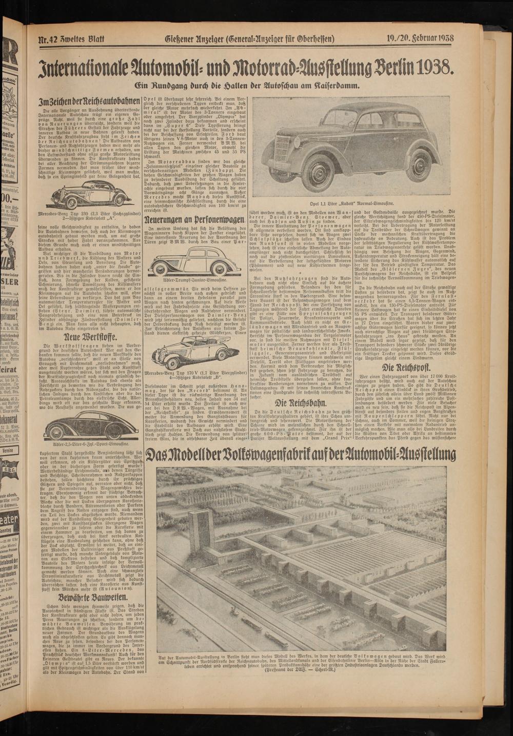 Aul der Automobil-Ausstellung in Berlin sieht man dieses Modell des Werkes, in dem der deutsche Volkswagen gebaut wird. Das Werk wird am Schnittpunkt der Nordsüdstrecke der Reichsautobahn, des Mittellandkanals und der Eisenbahnlinie Berlin—Köln in der Nähe der Stadt Fallers« 1 leben errichtet und entsprechend seiner späteren Produktionshöhe eine der größten Industrieanlagen Deutschlands werden.